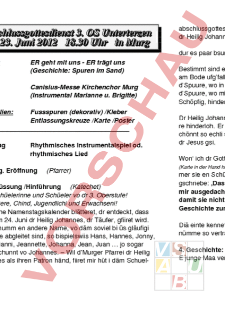 abschlussgottesdienst au IHN, dr Patron vo dä Pfarrei Murg, dr Heilig Johannes, dr Täufer. Drum wird dr Gottesdienst au 2 dur es paar bsunderi Gsäng vom Kirchechor Murg umrahmt. Thema: ER geht mit uns ER trägt uns (Geschichte: Spuren im Sand) Lieder: CanisiusMesse Kirchenchor Murg (Instrumental Marianne u. Brigitte) Materialien: Fussspuren (dekorativ) /Kleber Entlassungskreuze /Karte /Poster 1. Einzug Rhythmisches Instrumentalspiel od. rhythmisches Lied 2. Liturg. Eröffnung (Pfarrer) 3. Begrüssung /Hinführung (Katechet) Liebi Schüelerinne und Schüeler vo dr 3. Oberstufe! Liebi Eltere, Chind, Jugendlichi und Erwachseni! Wer imne Namenstagskalender blätteret, dr entdeckt, dass morn am 24. Juni dr Heilig Johannes, dr Täufer, gfiiret wird. Es git chumm en andere Name, vo däm soviel bi üs gläufigi Vornäme abgleitet sind, so bispielswiis Hans, Hannes, Jonny, Jens, Gianni, Jeannette, Johanna, Jean, Juan jo sogar Yannik chunnt vo Johannes. – Wil dMurger Pfarrei dr Heilig Johannes als ihren Patron händ, fiiret mir hüt däm Schuel Bestimmt sind eu, won‘ ihr in dChirche cho sind, diä ‚Spuure‘ am Bode ufgfalle. Sie lieget symbolhaft am Bode für dSpuure, wo in üsers Läbe iidruckt sind, aber au für dSpuure, wo mir im Läbe vo üsne Mitmensche, jo dr ganze Schöpfig, hinderlönd. Dr Heilig Johannes hät im Läbe vo Jesus au ganz tüüfi Spuu re hinderloh. Er hät nämli em Jesus dr Weg bahnt – me chönnt so echli säge, er sei dr Wegbereiter, dr Spuurleger für dr Jesus gsi. Won‘ ich dr Gottesdienst vorbereitet han, isch mir diä Charte (Karte in der Hand haltend!) in dHänd cho. Vor meh als 11 Johr hät mer sie en Schüeler in Briefchaste gworfe und hindedruf gschriebe: ‚Das wegen ihrem Vater tut mir leid. Ich habe mir ausgedacht, ihnen eine solche Karte zu schicken, damit sie nicht mehr so traurig sind. Bitte lesen Sie die Geschichte zum Trost!‘ Diä einte kennet viellicht diä Gschicht, dr andere isch sie nümme so vertraut, drum wett ich sie schnell verzehle: 4. Geschichte: ‚Spuren im Sand junge Maa verzehlt, was er träumt: „Ich han in dr Nacht träumt, ich sei mit Gott am Meer entlang glaufe. Vor mine Auge isch mir gsi, als öb mis ganzi Läbe so ähnlich wie imne Film vorübergoht. 3 (Fortsetzung Geschichte) Nochdem sletzti Bild an üs vorbiigange isch, han ich zrugg glueget und han festgstellt, dass in dä schwerste Zyte vo minem Läbe nur ei Spur im Sand iidruckt gsi isch. Das hät mich gwaltig verwirrt . und ich han mich ziemlich energisch an Gott gwendet. Ich han IHM gseit: „Won ich DIR vor es paar Johr über mis ganz Läbe verzehlt han, und DIR mis Läbe au übergäh han, um DIR no meh zvertraue, häsch DU mir gseit, DU würdest immer bi mir si. Warum häsch DU mich denn verloh, won ich DICH ganz ver zwieflet bruucht het? Mengisch gits Situatione im Läbe, wo mir vor Glücksgfühl am liebste würdet abhebe. Und denn gits au diä Täg, wo mir üs niedergschlage, muet und chraftlos fühlet. Im Buessakt wänd mir drüber noodenke: 5. Besinnung /Bussakt 4 (2 Schülerinnen) 1. Sch.: Isch das hüt wieder langwiilig! Was söllet mir do däm chliine Kaff nu mache. Mir fallt nüd Gschieds ii, dr ganz Tag nu ume‘ hänge! 2. Sch.: Wenn ich mich im Alltag noch echli Ab wechslig sehne, wenn ich us em Alltags trott möcht‘ uusbreche, denn wünscht ich mir, öppert chiem und würd‘ säge: „Chumm, mir machet zämme öppis! Do hät GOTT mini Hand gnoh . und hät gseit: Min liebe Fründ, nie han ich dich ellei loh, scho gar nüd in däne Zyte, wo du Angst gha häsch und verzwieflet gsi bisch. jetzt kurze Pause einlegen! Dört, wo du numme eis Paar Spuure im Sand gsiesch, dört chasch ganz sicher sii: 1. Sch.: DÖRT HAN ICH DICH TREIT!!!!! däne Wenn du so wiitermachsch, isch dine Ab schluss in dr Schuel sowieso gföhrdet. Glaubsch doch nüd im ernst, dass mit Note Lehrstell gfindsch! Uf dich wartet sicher niemert! 2. Sch.: Wenn vo anderne blossgstellt werde, wenn gspüür, dass benochteiligt werde, wenn gsieh, dass mini Chance immer chliiner werdet, denn wünscht‘ ich mir, es seit öppert: „Chumm, gib nüd uuf, ich stoh zu dir! Der gütige Gott verwandle alles Dunkle in uns in Licht. Er lasse uns spüren, wie er unser Begleiter ist, der uns sogar manchmal trägt, er erbarme sich unser im Namen des Vaters, des Sohnes und des Heiligen Geistes Amen. jetzt kurze Pause einlegen! 8. Gloria d. CanisiusMesse (gesungen v. Kirchenchor Murg) 1. Sch.: 5 (Fortsetzung ‚Bussakt‘) Min Grossvater hät uf Italie züglet, mit dä Eltere chann ich nüd so guet schwätze und mini best Fründin wett au nüd meh ztue ha mit mir. 2. Sch.: Wenn nümme mag und uusbrennt bii, wenn mi einsam und unverstande fühle, wenn nüd weiss, wies wiitergoh söll, denn wünscht‘ ich mir, öppert chiem und würd säge: „Chumm, mir gönd jetzt dr Weg es Stuck wiit mitenand! Mir chönntet sicher no meh so Alltagssituationne uufzehle, wo mir üs schwer und chalt wiene Stei fühlet. Drum tuet jetzt dr Chor stellvertretend für üs alli sErbarme Gottes erbitte. 6. Kyrie d. CanisiusMesse (gesungen v. Kirchenchor Murg) 7. Vergebungsbitte (Pfarrer) 6 9. Tagesgebet Guete Gott, Mengmol wünschet mir üs im Läbe öppert, wo üs dÄngst nimmt, öppert, wo üs mitrisst und aatriebt, öppert, wo üs hilft uufstoh und üs Muet macht. Liebe Gott, mir bruuchet dich als treue Läbesbegleiter. Dur dini Nöchi wachst in üs sVertraue, wo üs dur helli und dunkli Wegabschnitt treit. Drum bittet mir, dur Christus und in dr Chraft vom Heilige Geist. Amen. 10. Kurze Überleitung zur Lesung All üseri Vornäme händ Bedüütig. Dr Name ‚Johannes‘ be düütet: „Der Herr ist gnädig. – In dr Lesig ghöret mir, wie dr Johannes mit Gottes Gnade em Jesus dr Weg bereitet hät: 11. Lesung aus der Apostelgeschichte (Apg 13,16.2226) In Antiochia stand Paulus auf und sagte: Ihr Israeliten und ihr Gottesfürchtigen, hört! Gott erhob David zum König, von dem er bezeugte: ‚Ich habe David, den Sohn des Isai, a