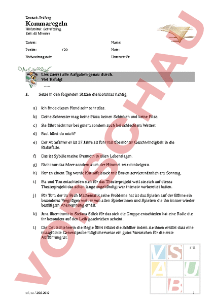 Deutsch, Prüfung Kommaregeln Hilfsmittel: Schreibzeug Zeit: 40 Minuten Datum: Name: Punkte: 20 Vorbereitungszeit: Note: Unterschrift: Lies zuerst alle Aufgaben genau durch. Viel Erfolg! 1. Setze in den folgenden Sätzen die Kommas richtig. a) Ich finde diesen Hund sehr sehr süss. b) Deine Schwester mag keine Pizza keinen Schinken und keine Pilze. c) Sie fährt nicht nur bei gutem sondern auch bei schlechtem Wettert. d) Paul hörst du mich? e) Der Autofahrer er ist 27 Jahre alt fuhr mit überhöhter Geschwindigkeit in die Radarfalle. f) Das ist Sybille meine Freundin in allen Lebenslagen. g) Nicht nur das Meer sondern auch der Himmel war dunkelgrau. h) Nur an einem Tag wurde Kartoffelstock mit Braten serviert nämlich am Sonntag. i) Pia und Tim entschieden sich für das Theaterprojekt weil sie sich auf dieses Theaterprojekt das schon lange angekündigt war intensiv vorbereitet hatten. j) Für Tom der im Fach Mathematik seine Probleme hat ist das Spielen auf der Bühne ein besonderes Vergnügen weil er von allen Spielerinnen und Spielern die ihn immer wieder bestätigten Anerkennung erhält. k) Jana übernimmt in Stefans Stück für das sich die Gruppe entschieden hat eine Rolle die ihr besonders auf den Leib geschrieben scheint. l) Die Deutschlehrerin die Regie führt tröstet die Schüler indem sie ihnen erklärt dass eine missglückte Generalprobe möglicherweise ein gutes Vorzeichen für die erste Aufführung ist. /6 sd, sa 26.9.2012 1 2. Kreuze die richtigen Sätze an und korrigiere die falschen mit einem roten Stift. Ein Rabe sass auf einem Baum und wollte sich gerade daranmachen, ein schönes, grosses Stück Käse zu verzehren, das er kurz zuvor gestohlen hatte. Aber vom Duft des Käses angelockt kam der Fuchs hinzu und stellte sich unter den Baum. Er überlegte wie, er dem Raben den Käse der doch so gut roch wegnehmen konnte. „Herr Rabe, ich habe gehört dass Ihr ein so begnadeter Sänger sein sollt. Ehrlich ich kann es nicht recht glauben. „Ich würde mich sehr freuen, wenn Ihr mir eine Kostprobe Eurer herrlichen Stimme geben würdet. War der Rabe so töricht dass er sein feines erst gerade erobertes Stück Käse, einfach so wieder hergeben würde? /3 3. Schreibe die Sätze so um, dass kein Komma mehr gesetzt werden muss. a) Möchten Sie ein Menu aus drei, aus vier oder aus fünf Gängen? b) Wir kauften Butter, Brot, Marmelade und Wurst. /2 4. Setze bei den folgenden Sätzen die Kommas so, dass zwei Sätze mit unterschiedlichem Sinn entstehen. a) Er verbietet dem Kind solche Witze zu erzählen. Er verbietet dem Kind solche Witze zu erzählen. b) Ich riet ihm endlich zu schreiben. Ich riet ihm endlich zu schreiben. c) Sabine meine Schwester und ich wohnen im gleichen Haus. Sabine meine Schwester und ich wohnen im gleichen Haus. /3 sd, sa 26.9.2012 2 sd, sa 26.9.2012 3 5. Bilde aus den folgenden zwei Sätzen einen einzigen und setze die Kommas richtig, du darfst auch ein Wort weglassen oder eines hinzufügen (Konjunktion). a) Wir verschieben die Schulreise. Der Wetterbericht meldet Regen. b) Ich bestehe darauf. Er muss das Geld zurückzahlen. c) Pia weint. Sie findet ihre Puppe nicht mehr. d) Du musst die Wörter gut lernen. Du scheibst einen guten Test. e) Von weitem bemerkte ich ein schwarzes Haus. Es war umgeben von einem dichten Tannenwald. f) Ich klopfte an die Tür. Ich hatte Angst davor. /6 sd, sa 26.9.2012 4