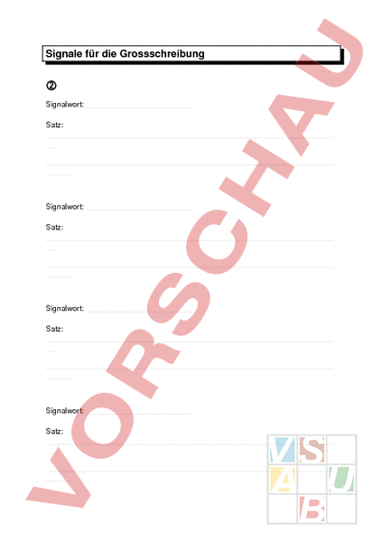 Signale für die Grossschreibung Signalwort: Satz: Signalwort: Satz: Signalwort: Satz: Signalwort: Satz: Signalwort: Satz: Signalwort: Satz: Sammle hier Nomen mit den Signalmorphemen aus der braunen Signallampe. (Die Sprachstarken 6, S. 83) Setze das Nomen wenn es möglich ist in den Plural (Mehrzahl). Falls nötig darfst du im Duden nachschauen. heit Dummheit keit Dummheiten nis Zeugnis ung Heiserkeit ling Zeugnisse schaft Herrschaft tum erei Herrschaften