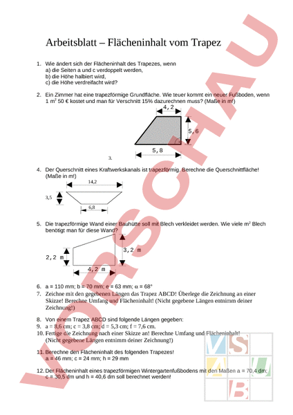 Arbeitsblatt – Flächeninhalt vom Trapez 1. Wie ändert sich der Flächeninhalt des Trapezes, wenn a) die Seiten und verdoppelt werden, b) die Höhe halbiert wird, c) die Höhe verdreifacht wird? 2. Ein Zimmer hat eine trapezförmige Grundfläche. Wie teuer kommt ein neuer Fußboden, wenn 1 m2 50 € kostet und man für Verschnitt 15% dazurechnen muss? (Maße in m!) 4,2 5,6 5,8 3. 4. Der Querschnitt eines Kraftwerkskanals ist trapezförmig. Berechne die Querschnittfläche! (Maße in m!) 14,2 3,5 6,8 5. Die trapezförmige Wand einer Bauhütte soll mit Blech verkleidet werden. Wie viele m2 Blech benötigt man für diese Wand? 3,2 2,2 4,2 6. 110 mm; 70 mm; 63 mm; 68 7. Zeichne mit den gegebenen Längen das Trapez ABCD! Überlege die Zeichnung an einer Skizze! Berechne Umfang und Flächeninhalt! (Nicht gegebene Längen entnimm deiner Zeichnung!) 8. Von einem Trapez ABCD sind folgende Längen gegeben: 9. 8,6 cm; 3,8 cm; 5,3 cm; 7,6 cm. 10. Fertige die Zeichnung nach einer Skizze an! Berechne Umfang und Flächeninhalt! (Nicht gegebene Längen entnimm deiner Zeichnung!) 11. Berechne den Flächeninhalt des folgenden Trapezes! 46 mm; 24 mm; 29 mm 12. Der Flächeninhalt eines trapezförmigen Wintergartenfußbodens mit den Maßen 70,4 dm; 30,5 dm und 40,6 dm soll berechnet werden! 13. Ein Eisenbahndamm hat eine trapezförmige Querschnittfläche, von der die Dammsohle a, die Dammkrone und die Höhe des Dammes gegeben sind! Zeichne den Damm im angegebenen Maßstab! 8,4 m; 3,2 m; 3 m; 1 100 Dammkrone Dammhöhe Dammsohle 14. Eine trapezförmige Giebelwand eines Hauses hat folgende Abmessungen: 8,2 m; 2,2 m; 3,2 m. Berechne den Flächeninhalt der Giebelwand! 15. Eine Tischplatte hat die Form eines Trapezes mit folgenden Maßen: 12,6 m; 3,5 und 4,8 m. Berechne den Flächeninhalt der Tischplatte! 16. Berechne den Flächeninhalt eines trapezförmigen Wandbehanges mit 3,4 m; 1,5 und 0,9 m! 17. Ein Gärtner legt ein Blumenbeet in der Form eines Trapezes an. Berechne den Flächeninhalt des Blumenbeetes mit den Maßen 128 cm; 84 cm; 74 cm! 18. Von einem trapezförmigen Holzstück mit den Seiten 78,7 cm und 56,5 cm, sowie der Höhe 43,3 cm soll der Flächeninhalt berechnet werden. 19. Ein Spiegel hat die Form eines Trapezes mit den Maßen 3,9 dm; 1,7 dm; 2,8 dm. Berechne den Flächeninhalt des Spiegels! 20. Zeichne das Trapez ABCD! Überlege die Zeichnung an einer Skizze! Berechne Umfang und Flächeninhalt! (Nicht gegebene Längen entnimm deiner Zeichnung!) 21. 7 cm; 3,5 cm; 4 cm; 50 22. Ein Zimmer hat die skizzierte Grundfläche. Wie teuer kommt ein neuer Fußboden, wenn 1 m2 58 € kostet und man für Verschnitt 15% dazurechnen muss? (Maße in m!) 4,2 5,6 2,4 5,8 23. Der Querschnittflächeninhalt eines Profileisens ist gesucht! 24. 390 mm; 290 mm; 110 mm; 25 mm; 170 mm 25. Berechne die Querschnittfläche des dargestellten Profileisens! 25 cm; 18 cm; 10 cm; 4 cm; 10 cm d 26. Der Flächeninhalt des Profileisenquerschnitts soll berechnet werden! 27. 90 mm; 25 mm; 50 mm; 16 mm; 10 mm a 28. Die Seitenfront eines Hauses soll mit rechteckigen Platten verkleidet werden. Wie viele m2 sind zu verkleiden? Maße in m! 3,8 8,2 5,6 7,6 8,4 29. Von einem Trapez ABCD kennt man: 8 cm; 6 cm; 3,5 cm; 5,2 cm. Überlege den Zeichenvorgang an einer Skizze! Berechne den Flächeninhalt! (Nicht gegebene Längen entnimm deiner Zeichnung!) 30. Das Trapez ABCD ist mit folgenden Angaben zu zeichnen: 6,8 cm; 3,9 cm; 3,2 cm; 4,4 cm! Überlege zuerst den Zeichenvorgang an einer Skizze! Berechne den Flächeninhalt! (Nicht gegebene Längen entnimm deiner Zeichnung!) 31. Berechne die Querschnittfläche eines Flussdammes, wenn die Dammsohle a, die Dammkrone und die Höhe des Dammes gegeben sind! Zeichne den Damm im Maßstab 1:200! 25 m; 9,8 m; 7 Dammkrone Dammhöhe Dammsohle 32. Berechne die Kosten des Anstriches für eine Hauswand, wenn für 1 m2 29 € zu bezahlen sind und 3% Skonto gewährt werden! 11,4 2,2 3,5 14,8 33. Ein Kraftwerksdamm soll angeschüttet werden. Berechne die Querschnittfläche dieses Dammes, wenn die Dammsohle a, die Dammkrone und die Höhe des Dammes gegeben sind: 22,4 m; 8,6 m; 5,2 m! Zeichne den Damm im Maßstab 1 200! Dammkrone Dammhöhe Dammsohle 34. Von einer trapezförmigen Holzplatte hat die längere Parallelseite eine Länge von 2 m, die andere ist um 80 cm kürzer. Wie viel € sind für die 1,4 hohe Platte zu bezahlen, wenn 1 m2 11 € kostet? 35. Schreib eine Formel für den Flächeninhalt mit den angegebenen Variablen auf! . 36. Mit den angegebenen Variablen soll eine Formel für den Flächeninhalt erstellt werden! z 37. Gib eine Formel für den Flächeninhalt mit den angegebenen Variablen an! . 38. 452 Gib eine Formel für den Flächeninhalt einer Hauswand an. Berechne die Kosten für einen Anstrich, wenn 2 m, 3,5 m, 1 m2 38 € kostet und und 3% Skonto gewährt werden! 13 x 15 39. Die Seitenfront eines Hauses soll mit rechteckigen Platten verkleidet werden. a) Wie viele m2 sind zu verkleiden? b) Für Verschnitt und Überdeckung werden 10% der Fläche dazugerechnet. Wie teuer kommt die Verkleidung, wenn 1 m2 mit 22 € zu bezahlen ist und 3% Skonto gewährt werden? Maße in m! 3,8 8,2 5,6 7,6 8,4 40. Zeichne das Trapez ABCD! Überlege den Zeichenvorgang an einer Skizze! Berechne den Flächeninhalt! (Nicht gegebene Längen entnimm deiner Zeichnung!) 12 cm; 6 cm; 3,8 cm; 7,5 cm Lösungen 1. a) wird verdoppelt b) wird halbiert c) wird verdreifacht 2. Lösungsvorschlag: (5,8 4,2).5,6 A 28 m2 2 15% Verschnitt 28 m 1,15; Kosten 32,2 50 € 1 610 € Die Bodenkosten betragen 1 610 €. 3. 2 14,22 6,8 3,5 36,75 m Der Querschnitt des Kraftwerkskanals beträgt 36,75 m. 4. Lösungsvorschlag: 2 3,2 2 2,2 4,2 11,34 m Für die Bauhütte benötigt man 11,34 m Blech. 5. 36 mm; 40 mm; 37 mm 256 mm ac 110 36 2 h 37 2 701 mm 2 40 36 37 6. 5,2 cm; 4,6 cm 22,9 cm ac 8,6 3,8 2 h 4,6 28,52 cm 2 5,2 4,6 7. ac 2 h 46 24 2 8. ac 2 h 70,4 30,5 2 9. ac 2 h 8,4 3,2 2 29 1 015 mm 40,6 2 048,27 dm 3 17,4 m 3,2 cm 3 cm 8,4 cm 10. 2 8,2 2