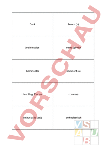 Bank bench (n) jmd einfallen come up with Kommentar comment (n) Umschlag; Einband cover (n) enthusiastic (adj) enthusiastisch finder (f) Finder give up aufgeben globe (n) Globus goal (n) Ziel grow up erwachsen werden increasing (adj) zunehmend Kenya Kenia label (v) etikettieren; beschriften lie (on) liegen (auf) look up nachschlagen note (n) Notiz; Vermerk paperback (n) Paperback; Taschenbuch pick up aufheben; mitnehmen pine tree (n) Kiefer produzieren produce (v) register (v) registrieren report back (v) zurückmelden; Bericht erstatten set up einrichten stand up aufstehen take out ausleihen, mitnehmen turn up auftauchen unique einmalig Vietnam Vietnam virtual (adj) virtuell