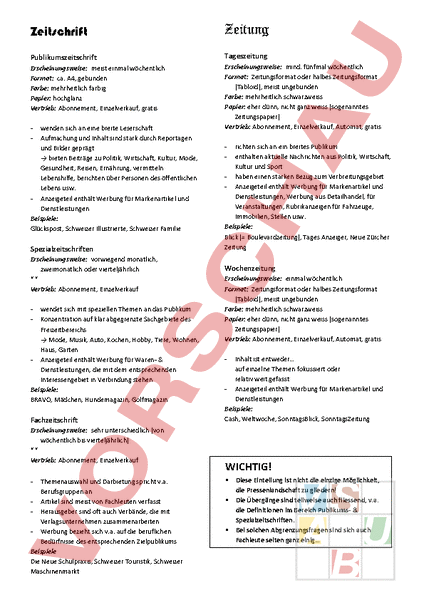 Zeitschrift Zeitung Publikumszeitschrift Tageszeitung Erscheinungsweise: meist einmal wöchentlich Format: ca. A4, gebunden Farbe: mehrheitlich farbig Papier: hochglanz Vertrieb: Abonnement, Einzelverkauf, gratis Erscheinungsweise: mind. fünfmal wöchentlich Format: Zeitungsformat oder halbes Zeitungsformat (Tabloid), meist ungebunden Farbe: mehrheitlich schwarzweiss Papier: eher dünn, nicht ganz weiss (sogenanntes Zeitungspapier) Vertrieb: Abonnement, Einzelverkauf, Automat, gratis wenden sich an eine breite Leserschaft Aufmachung und Inhalt sind stark durch Reportagen und Bilder geprägt bieten Beiträge zu Politik, Wirtschaft, Kultur, Mode, Gesundheit, Reisen, Ernährung, vermitteln Lebenshilfe, berichten über Personen des öffentlichen Lebens usw. Anzeigeteil enthält Werbung für Markenartikel und Dienstleistungen Beispiele: Glückspost, Schweizer Illustrierte, Schweizer Familie Spezialzeitschriften Erscheinungsweise: vorwiegend monatlich, zweimonatlich oder vierteljährlich Vertrieb: Abonnement, Einzelverkauf wendet sich mit speziellen Themen an das Publikum Konzentration auf klar abgegrenzte Sachgebiete des Freizeitbereichs Mode, Musik, Auto, Kochen, Hobby, Tiere, Wohnen, Haus, Garten Anzeigeteil enthält Werbung für Waren- Dienstleistungen, die mit dem entsprechenden Interessengebiet in Verbindung stehen Beispiele: BRAVO, Mädchen, Hundemagazin, Golfmagazin Fachzeitschrift Erscheinungsweise: sehr unterschiedlich (von wöchentlich bis vierteljährlich) Vertrieb: Abonnement, Einzelverkauf Themenauswahl und Darbietung spricht v.a. Berufsgruppen an Artikel sind meist von Fachleuten verfasst Herausgeber sind oft auch Verbände, die mit Verlagsunternehmen zusammenarbeiten Werbung bezieht sich v.a. auf die beruflichen Bedürfnisse des entsprechenden Zielpublikums Beispiele Die Neue Schulpraxis, Schweizer Touristik, Schweizer Maschinenmarkt richten sich an ein breites Publikum enthalten aktuelle Nachrichten aus Politik, Wirtschaft, Kultur und Sport haben einen starken Bezug zum Verbreitungsgebiet Anzeigeteil enthält Werbung für Markenartikel und Dienstleistungen, Werbung aus Detailhandel, für Veranstaltungen, Rubrikanzeigen für Fahrzeuge, Immobilien, Stellen usw. Beispiele: Blick ( Boulevardzeitung), Tages Anzeiger, Neue Zürcher Zeitung Wochenzeitung Erscheinungsweise: einmal wöchentlich Format: Zeitungsformat oder halbes Zeitungsformat (Tabloid), meist ungebunden Farbe: mehrheitlich schwarzweiss Papier: eher dünn, nicht ganz weiss (sogenanntes Zeitungspapier) Vertrieb: Abonnement, Einzelverkauf, Automat, gratis Inhalt ist entweder auf einzelne Themen fokussiert oder relativ weit gefasst Anzeigeteil enthält Werbung für Markenartikel und Dienstleistungen Beispiele: Cash, Weltwoche, SonntagsBlick, SonntagsZeitung WICHTIG! Diese Einteilung ist nicht die einzige Möglichkeit, die Pressenlandschaft zu gliedern! Die Übergänge sind teilweise auch fliessend, v.a. die Definitionen im Bereich Publikums- Spezialzeitschriften. Bei solchen Abgrenzungsfragen sind sich auch Fachleute selten ganz einig