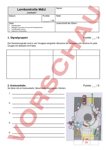 Lernkontrolle M&U Name: „Verkehr Datum: Punkte: Note: 29 Ziele: • • • • Unterschrift der Eltern: Signalgruppen Abbiegen nach links mit und ohne Einspurstrecke Vortrittsregeln kennen Fahren im Kreisverkehr 1. Signalgruppen Punkte 6 Die Strassensignale sind in vier Gruppen eingeteilt. Benenne die Gruppen und zeichne für jede Gruppe ein Beispiel mit Farbe. 2. Kreisverkehr. So fahre ich im Kreisverkehr. Beschreibe mit eigenen Worten. 1. 2. 3. 4. 5. Punkte 5 3. Signale erkennen. Punkte 3 Kreuze die richtige Antwort an. Pro Frage gibt es nur eine richtige Antwort. 4. Vortritt Punkte 6 Wer hat auf den Bildern den Vortritt? Kreise grün ein. Begründe genau in ganzen Sätzen, warum dieses Fahrzeug/Person Vortritt hat. 5. Links abbiegen ohne Einspurstrecke Punkte 5 Stelle dir vor, du möchtest auf einer Strasse ohne Einspurstrecke links abbiegen. Schreibe auf, was du der Reihe nach machst. 6. Links abbiegen mit Einspurstrecke Punkte 2 Zeichne auf dem Bild mit einer roten Linie ein, wie du mit dem Velo fahren musst um links abzubiegen. 7. Signale Welche Signale sind Vortrittssignale? Kreuze an. Punkte 2