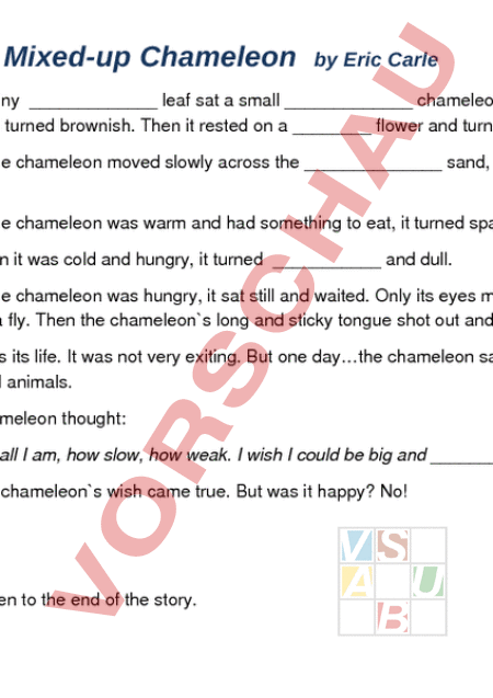 The Mixed-up Chameleon by Eric Carle On shiny leaf sat small chameleon. It moved onto tree and turned brownish. Then it rested on flower and turned reddish. When the chameleon moved slowly across the sand, it turned yellowish. You could hardly see it. When the chameleon was warm and had something to eat, it turned sparkling . But when it was cold and hungry, it turned and dull. When the chameleon was hungry, it sat still and waited. Only its eyes moved up, down, sideways – until it spottet fly. Then the chameleons long and sticky tongue shot out and caught the fly. That was its life. It was not very exiting. But one daythe chameleon saw zoo! It had never seen so many beautiful animals. The chameleon thought: How small am, how slow, how weak. wish could be big and like polar bear. And the chameleons wish came true. But was it happy? No! Now listen to the end of the story.