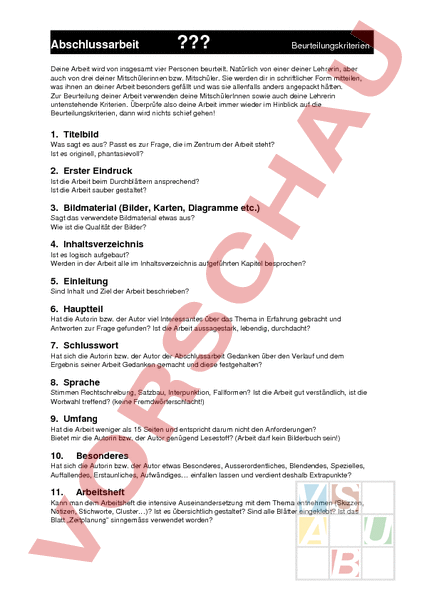 Abschlussarbeit ??? Beurteilungskriterien Deine Arbeit wird von insgesamt vier Personen beurteilt. Natürlich von einer deiner Lehrerin, aber auch von drei deiner Mitschülerinnen bzw. Mitschüler. Sie werden dir in schriftlicher Form mitteilen, was ihnen an deiner Arbeit besonders gefällt und was sie allenfalls anders angepackt hätten. Zur Beurteilung deiner Arbeit verwenden deine MitschülerInnen sowie auch deine Lehrerin untenstehende Kriterien. Überprüfe also deine Arbeit immer wieder im Hinblick auf die Beurteilungskriterien, dann wird nichts schief gehen! 1. Titelbild Was sagt es aus? Passt es zur Frage, die im Zentrum der Arbeit steht? Ist es originell, phantasievoll? 2. Erster Eindruck Ist die Arbeit beim Durchblättern ansprechend? Ist die Arbeit sauber gestaltet? 3. Bildmaterial (Bilder, Karten, Diagramme etc.) Sagt das verwendete Bildmaterial etwas aus? Wie ist die Qualität der Bilder? 4. Inhaltsverzeichnis Ist es logisch aufgebaut? Werden in der Arbeit alle im Inhaltsverzeichnis aufgeführten Kapitel besprochen? 5. Einleitung Sind Inhalt und Ziel der Arbeit beschrieben? 6. Hauptteil Hat die Autorin bzw. der Autor viel Interessantes über das Thema in Erfahrung gebracht und Antworten zur Frage gefunden? Ist die Arbeit aussagestark, lebendig, durchdacht? 7. Schlusswort Hat sich die Autorin bzw. der Autor der Abschlussarbeit Gedanken über den Verlauf und dem Ergebnis seiner Arbeit Gedanken gemacht und diese festgehalten? 8. Sprache Stimmen Rechtschreibung, Satzbau, Interpunktion, Fallformen? Ist die Arbeit gut verständlich, ist die Wortwahl treffend? (keine Fremdwörterschlacht!) 9. Umfang Hat die Arbeit weniger als 15 Seiten und entspricht darum nicht den Anforderungen? Bietet mir die Autorin bzw. der Autor genügend Lesestoff? (Arbeit darf kein Bilderbuch sein!) 10. Besonderes Hat sich die Autorin bzw. der Autor etwas Besonderes, Ausserordentliches, Blendendes, Spezielles, Auffallendes, Erstaunliches, Aufwändiges einfallen lassen und verdient deshalb Extrapunkte? 11. Arbeitsheft Kann man dem Arbeitsheft die intensive Auseinandersetzung mit dem Thema entnehmen (Skizzen, Notizen, Stichworte, Cluster)? Ist es übersichtlich gestaltet? Sind alle Blätter eingeklebt? Ist das Blatt „Zeitplanung sinngemäss verwendet worden?