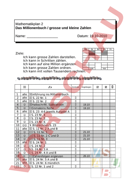 Arbeitsblatt: Mathiplan zum Zahlenbuch 4 Das Millionenbuch/ grosse und kleine Zahlen