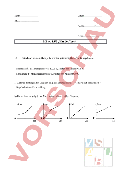 Name: Datum: Klasse: Punkte:_/ Note:_ MB 9 LU3 „Handy-Abos 1.) Petra kauft sich ein Handy. Ihr werden unterschiedliche Tarife angeboten: Normaltarif N: Monatsgrundpreis 10.95 €, Kosten pro Minute 0.15 €. Spezialtarif S: Monatsgrundpreis 0 €, Kosten pro Minute 0.39 €. a) Welcher der folgenden Graphen zeigt den Normaltarif N, welcher den Spezialtarif S? Begründe deine Entscheidung. b) Formuliere ein mögliches Abo zu den anderen beiden Graphen. 2.) Petra kauft sich ein Handy. Ihr werden unterschiedliche Tarife angeboten: Normaltarif N: Monatsgrundpreis 15 €, Kosten pro Minute 0.20 €. Spezialtarif S: Monatsgrundpreis Kosten pro Minute 0.40 €. Stelle die beiden Tarife im gleichen Koordinatensystem dar. Ab welcher Gesprächsdauer lohnt sich der Abschluss eines Abos zum Normaltarif? 0 €, 3.) Skizziere einen Graphen für: Die ersten 40 Gesprächsminuten werden zu einem höheren Preis verrechnet als darüber hinaus gehende Gesprächsminuten. Keine Grundgebühr. Zusätzlich zu einem fixen Preis je Gesprächsminute wird eine monatliche Grundgebühr verrechnet. Es wird lediglich ein fixer Preis je Gesprächsminute verrechnet. In der monatlichen Grundgebühr sind 60 Gesprächsminuten inbegriffen. 4.) Im Juli 2004 galten bei Swisscom folgende Tarife für Auslandgespräche auf dem Festnetz. Kenia gehört zur Gruppe der Länder mit den teuersten Verbindungen. Land, Vorwahl Wochentarif Wochenendtarif Sa/So CHF/min Land, Vorwahl CHF/min Wochentarif Wochenendtarif Sa/So CHF/min CHF/min Belgien 0032 0.25 0.20 Deutschland 0049 0.12 0.10 Frankreich 0033 0.12 0.10 Italien 0039 0.12 0.10 Serbien/ Montenegro 00381 0.65 0.50 Kenia 00254 1.60 1.40 Marokko 00212 1.25 1.00 Spanien 0034 0.25 0.20 USA 001 0.12 0.10 Argentinien 0054 0.65 0.50 Jemand behauptet, dass der Wochentarif immer 20 über dem Wochenendtarif liegt. Stimmt das? Jemand behauptet, dass die Nachbarländer günstiger sind als weiter entfernte Länder. Stimmt das? Jemand behauptet, dass ihn ein 10-minütiges Auslandgespräch über 40 CHF gekostet hat. Kann das sein? 5.) Buchenholz hat eine Dichte von 3,5g/cm3 a) Wie schwer ist ein Quader von 2m Länge, 50cm Breite und 10 dm Höhe? b) Welches Volumen hat ein 17,5 Kilogramm schwerer Quader? 6.) Heizöl wird in Kilogramm verkauft, es hat eine Dichte von ca. 800 kg/m 3. a) Wie viele Hektoliter Heizöl fasst ein Tank, der mit 1,2 Tonnen Heizöl gefüllt ist? b) Wie viele Kilogramm wiegen 3200 Liter Heizöl? 7.) Georg bezahlte letzten Monat 54.80 CHF für sein Handy-Abo. Die Grundgebühr beträgt 20 CHF. Ausserdem telefonierte er insgesamt 50 min zu 0.30 CHF sowie 22 min zu 0.60 CHF. Eine SMS kostet ihn 0.15 CHF. Wie viele SMS hat er geschrieben?