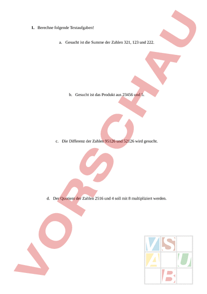 1. Berechne folgende Textaufgaben! a. Gesucht ist die Summe der Zahlen 321, 123 und 222. b. Gesucht ist das Produkt aus 23456 und 5. c. Die Differenz der Zahlen 95126 und 52126 wird gesucht. d. Der Quotient der Zahlen 2516 und 4 soll mit 8 multipliziert werden.