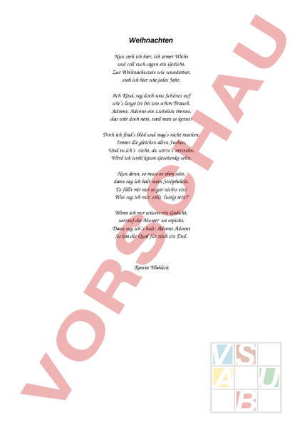 Weihnachten Nun steh ich hier, ich armer Wicht und soll euch sagen ein Gedicht. Zur Weihnachtszeit wie wunderbar, steh ich hier wie jedes Jahr. Ach Kind, sag doch was Schönes auf wies lange ist bei uns schon Brauch. Advent, Advent ein Lichtlein brennt, das wär doch nett, weil man es kennt! Doch ich finds blöd und mags nicht machen. Immer die gleichen alten Sachen. Und tu ichs nicht, du wirsts verstehn, Werd ich wohl kaum Geschenke sehn. Nun denn, so muss es eben sein, dann sag ich halt mein Ströphelein. Es fällt mir nur so gar nichts ein! Was sag ich nur, solls lustig sein? Wenn ich nur wüsste ein Gedicht, worauf die Mutter ist erpicht, Dann sag ichs halt: Advent Advent So hat die Qual für mich ein End. Katrin Wahlich