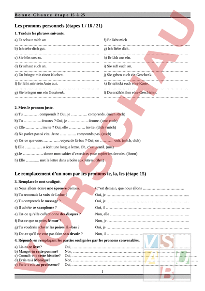 B n e h n e é a e 15 à 25 Les pronoms personnels (étapes 1 16 21) 1. Traduis les phrases suivants. a) Er schaut mich an. . b) Ich sehe dich gut. . c) Sie hört uns zu. . d) Er schaut euch an. . e) Du bringst mir einen Kuchen. . f) Er leiht mir sein Auto aus. . g) Sie bringen uns ein Geschenk. . f) Er liebt mich. . g) Ich liebe dich. . h) Er lädt uns ein. . i) Sie ruft euch an. . j) Sie geben euch ein Geschenk. . k) Er schickt euch eine Karte. . l) Du erzählst ihm eine Geschichte. . 2. Mets le pronom juste. a) Tu comprends Oui, je . comprends. (mich /dich) b) Tu écoutes Oui, je . écoute. (uns/ euch) c) Elle . invite Oui, elle . invite. (dich mich) d) Ne parlez pas si vite. Je ne . comprends pas. (euch) e) Est-ce que vous . voyez de là-bas Oui, on voit. (mich, dich) f) Elle écrit une longue lettre. Oh, cest gentil. (uns) g) Je . donne mon cahier dexercices pour copier les devoirs. (ihnen) h) Elle met la lettre dans boîte aux lettres. (ihm) Le remplacement dun nom par les pronoms le, la, les (étape 15) 3. Remplace le mot souligné. a) Nous allons écrire une épreuve demain. Cest demain, que nous allons b) Tu reconnais la voix de Leduc Oui, je . c) Tu comprends le message Oui, je . d) Il achète ce saxophone Oui, il . e) Est-ce quelle collectionne des disques Non, elle . f) Est-ce que tu peins le mur Non, je g) Tu voudrais acheter les poires là –bas Oui, je . h) Est-ce quil ne veut pas faire son devoir Non, il 4. Réponds en remplaçant les parties soulignées par les pronoms convenables. a) Lis-tu ce livre? b) Manges-tu cette pomme? c) Connaît-ette cette histoire? d) Ecris tu à Monique? e) Parle-t-elle au professeur? Oui, Non, Oui, Non, Oui, 1 f) Tu observes les filles g) Vois-tu ce pull-over? h) Achètes-tu les meubles? i) Ils vont répondre à Pierre? j) Pierre va ouvrir la porte? k) Veux-tu répondre à lami l) Répond-il à ses amis? Non, Oui, Non, Oui, Non, Oui, Non, 5. Remplace les groupes de mots écrits en caractères gras par des pronoms a) Jachète ce livre b) Je remercie ma tante. c) Je cueille les fleurs ouvertes. d) Le facteur demande son salaire. e) Nous regardons ce tableau. f) Jattends ma mère. g) Il obéit à son chef. h) Pierre ne plaît pas à Sophie. i) Paul téléphone à ses amis. j) Montre ce livre à ton père. k) Apporte ces photos à tes amis. l) Nous pensons beaucoup à vos parents. m) Jai confiance en mon amie. n) Nous pensons à notre amie. o) Nous nous souvenons de nos sœurs. p) Ce livre est à mon cousin. q) Nous nous approchons de ces gens. r) Je donne mon porte-monnaie à Paul. s) Jenvoie cette lettre à mon ami. t) Nous écrivons la carte à nos copines. u) Meli donne les fruits à ses invités. v) Il apprend la grammaire à ses élèves. w) Ils offrent ce cadeau à leurs amis. x) Il laisse ses chats à son voisin. y) Le facteur donne cette lettre à Rea. z) Vous téléphones à vos voisins. Les pronoms personnelles fortes 6. Traduis les phrases suivantes. a) Wer spielt mit mir . b) Ich gehe zu ihnen. . c) Mutter bereitet einen Kuchen für uns vor. . d) Die Blumen sind für dich. . e) Sprecht ihr von ihnen . Les pronom « » et « en » 2 f) Er kommt mit mir. . g) Nadia kommt heute zu ihm. . h) Ich bin hinter dir. . i) Ich denke an sie. . j) Warte auf mich . o n C a c é a e 15 à 25 7. Remplace par le pronom ou en. a) Elle pense à sa valise. Elle b) Tu réfléchis à ton anniversaire. Tu c) Il va chez le médecin. Il d) Je viens de ma maison. J. e) Nous parlons de ce livre. Nous . f) Je vais à Paris. J. g) Je pense toujours à mes vacances. J. h) Nous parlons de ce livre. Nous . i) Jai des bonbons. Est-ce que tu veux 8. Mets le pronom ou en en répondant. a) Tu viens de la ville Oui, b) Elle retourne au lycée Non, c) Tu viens de la fête Oui, . d) Alors, vous me parlez delle Non, e) Tu viens de Vienne Oui,. f) Il descend de la voiture Oui, il g) Papa est rentré du bureau Non, h) Est-ce que tu toccupes de cette affaire Oui, i) Tu as envie de prendre un café Oui, j) Vous vous rappelez du film Oui, . k) Tu prends de la mayonnaise Oui, l) Le sac est dans larmoire Oui, il m) Il un appartement Non, n) Combien de frères est-ce que tu as J ai deux. o) Pilou vous attend à la gare Oui, il . p) Est-ce que vous avez vu beaucoup de jeunes filles Oui, q) Vous habitez en France Non, r) Tu es arrivé à faire le gâteau seul Oui, . suis arrivé. s) Est-ce quil a encore du pain Oui, il . t) Tu as déjà été à Paris Non, je u) Tu vois quelque chose là-bas Non, je v) Il va souvent en Angleterre Non, il w) Est-ce quil a encore de la salade Non, x) Tu te souviens de ce roman Non, y) Est-ce quil a encore des tomates Oui, . 3 Deux pronoms à la fois. 9. Remplace les mots soulignés. a) Il mécrit une longue lettre. . b) Elle écrit une longue lettre à Pierre. . c) Il va técrire une longue lettre. . d) Il me laisse écrire une longue lettre. . e) Il me laisse écrire une longue lettre à Reto. . f) Je donne la poupée à ma petite sœur. . g) Le prof. pose des questions aux élèves. . h) Papa achète deux vélos aux enfants. . i) Elle raconte des histoires à Marianne. . j) Il ouvre la porte au Monsieur. . k) Il explique la grammaire à mes amis. . l) Elle vend la vielle voiture à nous. . m) Le père offre un voyage à ses enfants. . n) Je montre lhôtel au Monsieur. . o) Je rends lenfant perdu à cet homme. . p) Elle montre son cahier au professeur. . q) Papa rencontre les enfants à la gare. . r) Les filles parlent de la fête aux amis. . s) Il ne me parle pas de son problème. . t) Il veut donner un cadeau à son frère. . u) Elle va expliquer la règle aux élèves. . v) Ne me parle pas de cette affaire. . w) Vous organisez une fête à votre mari. . x) Elle souhaite Bonne Chance au vendeur. . y) Elle envoie une carte à sa tante. . z) Ils montrent des photos aux enfants. . Limpératif affirmatif et négatif 10. Remplace les parties soulignées par les pronoms convenables en utilisant limpératif négatif ou affirmatif. a) Réponds aux camara