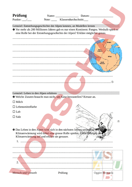 Prüfung Punkte:/_ Name: Datum: Note: Klassendurchschnitt:_ Lernziel: Entstehungsgeschichte der Alpen kennen, an Modellen lernen Vor mehr als 200 Millionen Jahren gab es nur einen Kontinent: Pangea. Weshalb spielt er eine Rolle bei der Entstehungsgeschichte der Alpen? Erkläre möglichst genau. . . . . . . /3 Lernziel: Leben in den Alpen erfahren Welche Zutaten braucht man nicht, um Käse herzustellen? Kreuze an. Milch Lebensmittelfarbe Lab Salz /1 Das Leben in den Alpen wird sich in den nächsten Jahren verändern. Vor allem die Klimaerwärmung wird dabei eine grosse Rolle spielen. Zähle 3 Folgen der Klimaerwärmung auf und erkläre sie genauer. 1. . . . 2. . Mensch und Umwelt Prüfung Oggier Bernarda Prüfung Name: Datum: . . 3. . . /6 Lernziel: Lebensbedingungen in den Alpen kennen Wie heissen diese Pflanzen? /3 Beschreibe, wie die Pflanze aussieht und erkläre, weshalb sie an das Leben in den Bergen besonders gut angepasst ist. . . . . . . /3 Welche drei Raubtiere sind in den Schweizer Alpen lange Zeit ausgestorben gewesen und sind jetzt wieder heimisch? Zähle sie auf. 1. 2. 3. Mensch und Umwelt Prüfung Oggier Bernarda Prüfung Name: Datum: /3 Die Wölfe sind in den Walliser Alpen nicht gern gesehene Gäste. Kannst du erklären, weshalb dies so ist? . . . . /2 Zähle die Höhenstufen auf und erkläre sie kurz. 1. . . 2 . . 3 . . 4. Mensch und Umwelt Prüfung Oggier Bernarda Prüfung Name: Datum: . . /4 Mensch und Umwelt Prüfung Oggier Bernarda