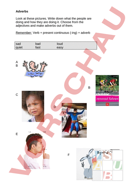 Adverbs Look at these pictures. Write down what the people are doing and how they are doing it. Choose from the adjectives and make adverbs out of them. Remember: Verb present continuous (-ing) adverb sad quiet bad fast loud easy B C