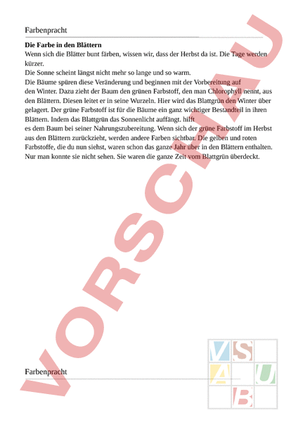 Farbenpracht Die Farbe in den Blättern Wenn sich die Blätter bunt färben, wissen wir, dass der Herbst da ist. Die Tage werden kürzer. Die Sonne scheint längst nicht mehr so lange und so warm. Die Bäume spüren diese Veränderung und beginnen mit der Vorbereitung auf den Winter. Dazu zieht der Baum den grünen Farbstoff, den man Chlorophyll nennt, aus den Blättern. Diesen leitet er in seine Wurzeln. Hier wird das Blattgrün den Winter über gelagert. Der grüne Farbstoff ist für die Bäume ein ganz wichtiger Bestandteil in ihren Blättern. Indem das Blattgrün das Sonnenlicht auffängt. hilft es dem Baum bei seiner Nahrungszubereitung. Wenn sich der grüne Farbstoff im Herbst aus den Blättern zurückzieht, werden andere Farben sichtbar. Die gelben und roten Farbstoffe, die du nun siehst, waren schon das ganze Jahr über in den Blättern enthalten. Nur man konnte sie nicht sehen. Sie waren die ganze Zeit vom Blattgrün überdeckt. Farbenpracht Die Farbe in den Blättern Wenn sich die Blätter bunt färben, wissen wir, dass der da ist. Die Tage werden . Die Sonne scheint längst nicht mehr so und so . Die Bä spüren diese Veränderung und beginnen mit der Vorbereitung auf den . Dazu zieht der Baum den grünen Farbstoff, den man Chlorophyll nennt, aus den Blättern. Diesen leitet er in seine . Hier wird das Blattgrün den Winter über gelagert. Der Farbstoff ist für die Bäume ein ganz wichtiger Bestandteil in ihren Blättern. Indem das Blattgrün das Sonnenlicht auffängt. hilft es dem Baum bei seiner Nahrungszubereitung. Wenn sich der grüne im Herbst aus den Blättern zurückzieht, werden andere Farben sichtbar. Die gelben und roten Farbstoffe, die du nun siehst, waren schon das ganze über in den Blättern enthalten. Nur man konnte sie nicht sehen. Sie waren die ganze Zeit vom überdeckt