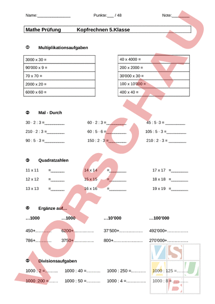 Name:_ Mathe Prüfung Punkte:_ 48 Note: Kopfrechnen 5.Klasse Multiplikationsaufgaben 3000 30 40 4000 90 00 9 200 2000 70 70 30 00 30 2000 20 100 10 00 6000 60 400 40 Mal Durch 30 2 3 60 2 3 45 5 3 210 2 3 60 5 6 105 5 3 90 5 3 150 2 3 210 2 3 Quadratzahlen 11 11 14 14 17 17 12 12 15 15 18 18 13 13 16 16 19 19 Ergänze auf 1000 1000 10000 100000 450. 6200. 37500. 492000. 786. 3750. 800 270000. Divisionsaufgaben 1000 2 . 1000 40 . 1000 250 1000 125 . 1000 :200 . 1000 50 . 1000 4 1000 8 . Name:_ Punkte:_ 48 Note: Bruchteile von 1000 1/8 von 1000 von 1000 3/5 von 1000 3/8 von 1000 1/40 von 1000 5/100 von 1000 . 5/8 von 1000 4/5 von 1000 1/50 von 1000 1/3 von 60 1/5 von 60 1/15 von 60 7/30 von 60 5/6 von 60 1/12 von 60 Bruchteile von 60 Runde auf Zehner, Hunderter, Tausender. 234567 23456 2345 234 Zehner Hunderter Tausender Grössen! 1km m 1m km 1m. dm 1dm .m 1m .cm 1cm m 1m mm 1mm m 1hl l 1l hl 1l dl 1dl l 1l cl 1cl l 1l ml 1ml .l 1t .kg 1kg .t 1kg .g 1g kg 1g mg 1mg .g 23