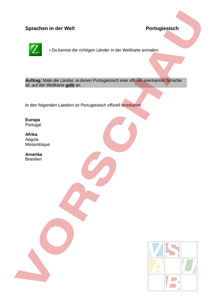 Sprachen in der Welt Portugiesisch • Du kannst die richtigen Länder in der Weltkarte anmalen. Auftrag: Male die Länder, in denen Portugiesisch eine offiziell anerkannte Sprache ist, auf der Weltkarte gelb an. In den folgenden Ländern ist Portugiesisch offiziell anerkannt: Europa Portugal Afrika Angola Mosambique Amerika Brasilien
