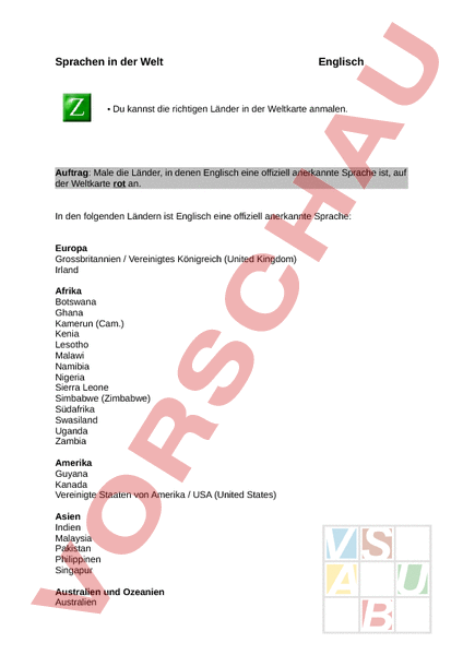 Sprachen in der Welt Englisch • Du kannst die richtigen Länder in der Weltkarte anmalen. Auftrag: Male die Länder, in denen Englisch eine offiziell anerkannte Sprache ist, auf der Weltkarte rot an. In den folgenden Ländern ist Englisch eine offiziell anerkannte Sprache: Europa Grossbritannien Vereinigtes Königreich (United Kingdom) Irland Afrika Botswana Ghana Kamerun (Cam.) Kenia Lesotho Malawi Namibia Nigeria Sierra Leone Simbabwe (Zimbabwe) Südafrika Swasiland Uganda Zambia Amerika Guyana Kanada Vereinigte Staaten von Amerika USA (United States) Asien Indien Malaysia Pakistan Philippinen Singapur Australien und Ozeanien Australien Fidschi-Inseln Neuseeland Papua-Neuguinea