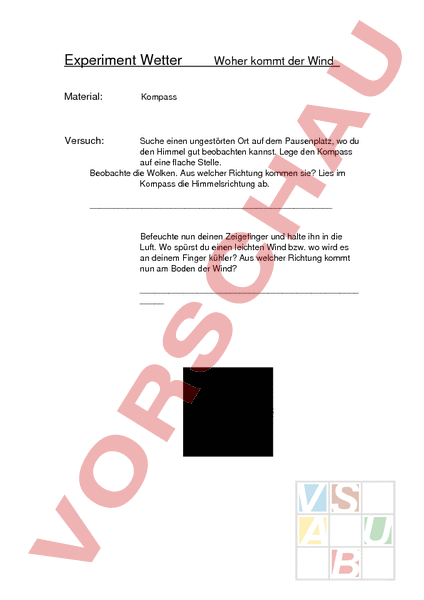 Experiment Wetter Material: Woher kommt der Wind Kompass Versuch: Suche einen ungestörten Ort auf dem Pausenplatz, wo du den Himmel gut beobachten kannst. Lege den Kompass auf eine flache Stelle. Beobachte die Wolken. Aus welcher Richtung kommen sie? Lies im Kompass die Himmelsrichtung ab. Befeuchte nun deinen Zeigefinger und halte ihn in die Luft. Wo spürst du einen leichten Wind bzw. wo wird es an deinem Finger kühler? Aus welcher Richtung kommt nun am Boden der Wind? QuickTimeª and adecompressor TIFF (Unkomprimiert) are needed to see this picture.