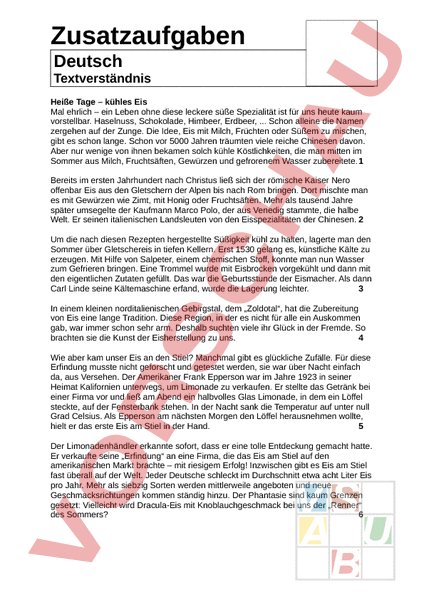 Zusatzaufgaben Deutsch Textverständnis Heiße Tage – kühles Eis Mal ehrlich – ein Leben ohne diese leckere süße Spezialität ist für uns heute kaum vorstellbar. Haselnuss, Schokolade, Himbeer, Erdbeer, . Schon alleine die Namen zergehen auf der Zunge. Die Idee, Eis mit Milch, Früchten oder Süßem zu mischen, gibt es schon lange. Schon vor 5000 Jahren träumten viele reiche Chinesen davon. Aber nur wenige von ihnen bekamen solch kühle Köstlichkeiten, die man mitten im Sommer aus Milch, Fruchtsäften, Gewürzen und gefrorenem Wasser zubereitete.1 Bereits im ersten Jahrhundert nach Christus ließ sich der römische Kaiser Nero offenbar Eis aus den Gletschern der Alpen bis nach Rom bringen. Dort mischte man es mit Gewürzen wie Zimt, mit Honig oder Fruchtsäften. Mehr als tausend Jahre später umsegelte der Kaufmann Marco Polo, der aus Venedig stammte, die halbe Welt. Er seinen italienischen Landsleuten von den Eisspezialitäten der Chinesen. 2 Um die nach diesen Rezepten hergestellte Süßigkeit kühl zu halten, lagerte man den Sommer über Gletschereis in tiefen Kellern. Erst 1530 gelang es, künstliche Kälte zu erzeugen. Mit Hilfe von Salpeter, einem chemischen Stoff, konnte man nun Wasser zum Gefrieren bringen. Eine Trommel wurde mit Eisbrocken vorgekühlt und dann mit den eigentlichen Zutaten gefüllt. Das war die Geburtsstunde der Eismacher. Als dann Carl Linde seine Kältemaschine erfand, wurde die Lagerung leichter. 3 In einem kleinen norditalienischen Gebirgstal, dem „Zoldotal, hat die Zubereitung von Eis eine lange Tradition. Diese Region, in der es nicht für alle ein Auskommen gab, war immer schon sehr arm. Deshalb suchten viele ihr Glück in der Fremde. So brachten sie die Kunst der Eisherstellung zu uns. 4 Wie aber kam unser Eis an den Stiel? Manchmal gibt es glückliche Zufälle. Für diese Erfindung musste nicht geforscht und getestet werden, sie war über Nacht einfach da, aus Versehen. Der Amerikaner Frank Epperson war im Jahre 1923 in seiner Heimat Kalifornien unterwegs, um Limonade zu verkaufen. Er stellte das Getränk bei einer Firma vor und ließ am Abend ein halbvolles Glas Limonade, in dem ein Löffel steckte, auf der Fensterbank stehen. In der Nacht sank die Temperatur auf unter null Grad Celsius. Als Epperson am nächsten Morgen den Löffel herausnehmen wollte, hielt er das erste Eis am Stiel in der Hand. 5 Der Limonadenhändler erkannte sofort, dass er eine tolle Entdeckung gemacht hatte. Er verkaufte seine „Erfindung an eine Firma, die das Eis am Stiel auf den amerikanischen Markt brachte – mit riesigem Erfolg! Inzwischen gibt es Eis am Stiel fast überall auf der Welt. Jeder Deutsche schleckt im Durchschnitt etwa acht Liter Eis pro Jahr. Mehr als siebzig Sorten werden mittlerweile angeboten und neue Geschmacksrichtungen kommen ständig hinzu. Der Phantasie sind kaum Grenzen gesetzt: Vielleicht wird Dracula-Eis mit Knoblauchgeschmack bei uns der „Renner des Sommers? 6 1. Aufgabe Kreuze an, was diese Aussagen bedeuten. a) „Schon alleine die Namen zergehen auf der Zunge. Beim Aussprechen der Namen denkt man an den Genuss. Die Namen werden schön ausgesprochen. Man weiß einen Namen und kann ihn nicht aussprechen. b) „Das war die Geburtsstunde der Eismacher. Eine neue Eissorte wurde von den Eismachern erfunden. Das war der Geburtstag des Eismachers. Seit dieser Zeit gibt es Eismacher. 2. Aufgabe Was hatten diese Personen mit der Eisherstellung zu tun? Kreuze die jeweils richtige Aussage an. träumten von 5000 Eissorten. Die Chinesen . konnten bereits vor 5000 Jahren Speiseeis zubereiten. genossen vor 5000 Jahren nur die Sorten Haselnuss, Schokolade, Himbeere und Erdbeere. lernte in einem norditalienischen Gebirgstal das Speiseeis kennen. Kaiser Nero . weihte im Jahr 1530 in Rom die erste Eisdiele ein. genoss das aus den Alpen herangebrachte Eis in Rom. stieß bei der Entdeckung Venedigs auf Eisdielen. Marco Polo . brachte die chinesischen Eisrezepte nach Italien. besaß einen Keller, in dem viel Gletschereis gelagert wurde. entdeckte nach langem Forschen das Eis am Stiel. Frank Epperson . war Limonadenhändler, der kein Eis mochte. erfand unbeabsichtigt das Eis am Stiel. 3. Aufgabe Jeder Satz passt zu jeweils einem der sechs Textabschnitte. Schreibe die richtige Nummer in das entsprechende Kästchen. Die Eisproduktion ging von Italien aus und kam zu uns nach Deutschland. Durch eine zufällige Handlung entstand ein Limonadeneis, das einen Stiel besaß. Schon seit langer Zeit kannte man Eis – aber nur wenige Menschen konnten dieses auch genießen. 4. Aufgabe Erkläre die folgenden Wörter aus dem Text, indem du die jeweils richtige Lösung ankreuzt. „Spezialität Besonderheit Gewürz Zufall „Region eine Gegend Stadt in Italien Glaubensrichtung „Kalifornien amerikanische Rosinensorte Geburtsort eines amerikanischen Kalifen amerikanischer Bundesstaat 5. Aufgabe Kreuze an, ob die jeweilige Aussage richtig, falsch oder nicht im Text enthalten ist. Richtig Falsch Nicht enthalten Der römische Kaiser Nero aß Eis mit Gewürzen. Durch die Erfindung der Kältemaschine konnte man Eis länger lagern. Eis am Stiel sorgte zuerst in Italien für riesigen Erfolg. Im Zoldotal gab es jeden Sonntag Eis. Marco Polo aß gerne Eis. 6. Aufgabe Kreuze jeweils die richtige Fortsetzung des Satzes an. Beachte dabei den Text genau. Der Löffel, den Epperson in ein Glas Limonade steckte, fror über Nacht fest, weil . die Temperatur unter den Gefrierpunkt sank. Limonade viel Zucker enthält. er es in den Gefrierschrank stellte. Mit Hilfe von Salpeter konnte man feuchte Luft erzeugen. Gletschereis erzeugen. Eis zum Kühlen erzeugen. 7. Aufgabe Welche Frage kannst du jeweils mit Hilfe des Textes beantworten? Setze pro Kasten nur ein Kreuz. Wie brachte man das Eis aus den Alpen nach Rom? Wie oft gab es an Kaiser Neros Hof Eis zum Nachtisch? Woraus wurde das Eis am römischen Kaiserhof hergestellt? Welches Lieblingseis hatte Kaiser Nero? Warum waren die Leute im Zold