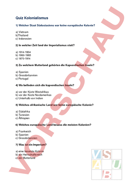 10 Fragen zum Kolonialismus mit je 3 Antworten zur Auswahl