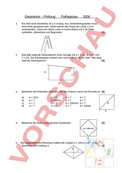 Geometrie – Prüfung: 1. 2. Pythagoras 2006 Ein Arm einer Bockleiter ist 2.4 lang. Aus Sicherheitsgründen muss eine Kette gespannt sein. Dann stehen die Füsse der Leiter 1.4 auseinander. Lässt sich diese Leiter in einem Raum mit 2.35 Höhe aufstellen. (Berechne und Begründe) (2) Das Bild zeigt die Seitenansicht einer Garage mit 3.1m, 6m und 2m. Die Dachsparren stehen vorn und hinten je 30 cm über. Wie lang sind die Dachsparren? (4) c 3. Berechne die fehlenden Grössen. Gib die Antwort zuerst mit Formeln an. (4) a) b) c) d) 12m a? a? a? U? U 64cm U? U? A? A? 100 km A? d? d? d? 24mm a 4. Berechne die Seite des grossen Quadrates. (3) 100 cm 5. Die Diagonalen des Rhombus haben die Längen 10cm und 16cm. Berechne den Umfang U. (3) f 6. Berechne den Umfang des Trapezes. (5) 45 mm 7. 55 mm Wie gross ist der Umfang des Vielecks? (1 Häuschen 1cm) (4) F A