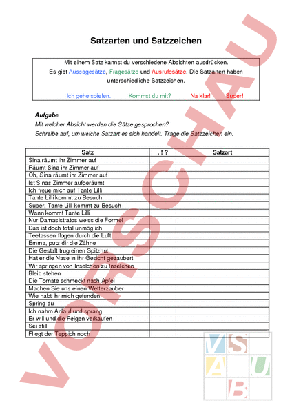 Satzarten und Satzzeichen Mit einem Satz kannst du verschiedene Absichten ausdrücken. Es gibt Aussagesätze, Fragesätze und Ausrufesätze. Die Satzarten haben unterschiedliche Satzzeichen. Ich gehe spielen. Kommst du mit? Na klar! Super! Aufgabe Mit welcher Absicht werden die Sätze gesprochen? Schreibe auf, um welche Satzart es sich handelt. Trage die Satzzeichen ein. Satz Sina räumt ihr Zimmer auf Räumt Sina ihr Zimmer auf Oh, Sina räumt ihr Zimmer auf Ist Sinas Zimmer aufgeräumt Ich freue mich auf Tante Lilli Tante Lilli kommt zu Besuch Super, Tante Lilli kommt zu Besuch Wann kommt Tante Lilli Nur Damasistratos weiss die Formel Das ist doch total unmöglich Teetassen flogen durch die Luft Emma, putz dir die Zähne Die Gestalt trug einen Spitzhut Hat er die Nase in ihr Gesicht gezaubert Wir springen von Inselchen zu Inselchen Bleib stehen Die Tomate schmeckt nach Apfel Machen Sie uns einen Wetterzauber Wie habt ihr mich gefunden Spring du Ich nahm Anlauf und sprang Er will und die Feigen verkaufen Sei still Fliegt der Teppich noch .!? Satzart