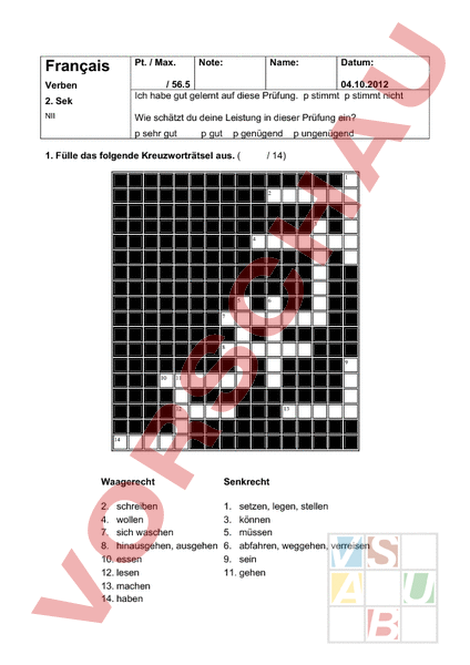 Français Pt. Max. Verben 56.5 04.10.2012 Ich habe gut gelernt auf diese Prüfung. stimmt stimmt nicht 2. Sek NII Note: Name: Datum: Wie schätzt du deine Leistung in dieser Prüfung ein? sehr gut gut genügend 1. Fülle das folgende Kreuzworträtsel aus. ungenügend 14) 1 2 3 4 5 6 7 8 9 10 11 12 13 14 Waagerecht Senkrecht 2. schreiben 4. wollen 7. sich waschen 8. hinausgehen, ausgehen 10. essen 12. lesen 13. machen 14. haben 1. setzen, legen, stellen 3. können 5. müssen 6. abfahren, weggehen, verreisen 9. sein 11. gehen 2. Konjugiere die Verben. Beachte die in Klammer angegebene Zeitform. (wenn nichts steht Präsens p.c. passé composé 24) f.c. futur composé) avoir ils/elles il/elle (p.c.) être vous tu (p.c.) faire vous il (f.c.) aller tu ils/elles sortir je nous partir il/elle tu pouvoir tu ils/elles vouloir je nous écrire nous ils/elles lire vous tu se laver je vous parler tu ils/elles 3. Übersetze folgende Sätze, achte auf die Zeitform. a) Wir fahren in die Ferien ab. b) Ich habe einen Brief geschrieben. c) Wir müssen essen. d) Wir sind 14 Jahre alt. e) Am Sonntag sind wir ins Kino gegangen. (p.c.) (f.c.) 8) 4. Übersetze folgende Sätze und setze sie anschliessend in die angegebene Zeitform. / 10.5) a) Sie kann Klavier spielen. p.c. b) Wir haben ein Buch gelesen. f.c. c) Ihr werdet einen Test machen. p.c. d) Am Wochenende esst ihr einen Apfel. f.c.