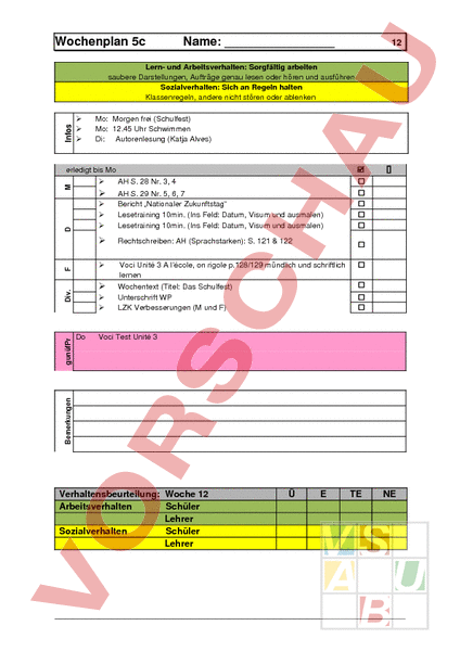 Wochenplan 5c Name: 12 Infos Lern und Arbeitsverhalten: Sorgfältig arbeiten saubere Darstellungen, Aufträge genau lesen oder hören und ausführen Sozialverhalten: Sich an Regeln halten Klassenregeln, andere nicht stören oder ablenken Mo: Morgen frei (Schulfest) Mo: 12.45 Uhr Schwimmen Di: Autorenlesung (Katja Alves) erledigt bis Mo AH S. 28 Nr. 3, 4 AH S. 29 Nr. 5, 6, 7 Bericht „Nationaler Zukunftstag Lesetraining 10min. (Ins Feld: Datum, Visum und ausmalen) Lesetraining 10min. (Ins Feld: Datum, Visum und ausmalen) Rechtschreiben: AH (Sprachstarken): S. 121 122 Voci Unité 3 lécole, on rigole p.128/129 mündlich und schriftlich lernen Wochentext (Titel: Das Schulfest) Unterschrift WP LZK Verbesserungen (M und F) Div. Do Voci Test Unité 3 Bemerkungen gunüfPr Verhaltensbeurteilung: Woche 12 Arbeitsverhalten Schüler Lehrer Sozialverhalten Schüler Lehrer Ü TE NE Unterschrift der Eltern: