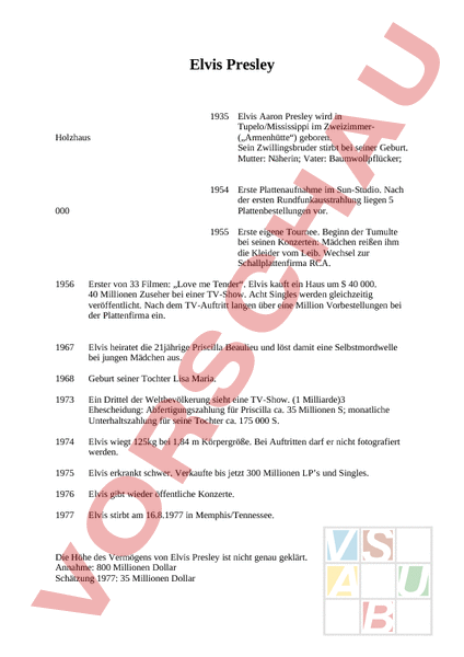 Elvis Presley Holzhaus 000 1935 Elvis Aaron Presley wird in Tupelo/Mississippi im Zweizimmer(„Armenhütte) geboren. Sein Zwillingsbruder stirbt bei seiner Geburt. Mutter: Näherin; Vater: Baumwollpflücker; 1954 Erste Plattenaufnahme im Sun-Studio. Nach der ersten Rundfunkausstrahlung liegen 5 Plattenbestellungen vor. 1955 Erste eigene Tournee. Beginn der Tumulte bei seinen Konzerten: Mädchen reißen ihm die Kleider vom Leib. Wechsel zur Schallplattenfirma RCA. 1956 Erster von 33 Filmen: „Love me Tender. Elvis kauft ein Haus um 40 000. 40 Millionen Zuseher bei einer TV-Show. Acht Singles werden gleichzeitig veröffentlicht. Nach dem TV-Auftritt langen über eine Million Vorbestellungen bei der Plattenfirma ein. 1967 Elvis heiratet die 21jährige Priscilla Beaulieu und löst damit eine Selbstmordwelle bei jungen Mädchen aus. 1968 Geburt seiner Tochter Lisa Maria. 1973 Ein Drittel der Weltbevölkerung sieht eine TV-Show. (1 Milliarde)3 Ehescheidung: Abfertigungszahlung für Priscilla ca. 35 Millionen S; monatliche Unterhaltszahlung für seine Tochter ca. 175 000 S. 1974 Elvis wiegt 125kg bei 1,84 Körpergröße. Bei Auftritten darf er nicht fotografiert werden. 1975 Elvis erkrankt schwer. Verkaufte bis jetzt 300 Millionen LPs und Singles. 1976 Elvis gibt wieder öffentliche Konzerte. 1977 Elvis stirbt am 16.8.1977 in Memphis/Tennessee. Die Höhe des Vermögens von Elvis Presley ist nicht genau geklärt. Annahme: 800 Millionen Dollar Schätzung 1977: 35 Millionen Dollar Stundenbild Lehofer Elke MBIV/b2 8.5.1996 HS 26/2B3B/Musik Betreuungslehrerin: Danielczyk Sigrid Lehrstoff: Elvis Presley und sein Leben Schwerpunkt: Sicherung des Unterrichtsertrages Feinziele: wissen. 1) Schüler sollen über das Leben und seinen Werdegang bescheid 2) Schüler sollen sich vorstellen können unter welchen Bedingungen er lebte. 3) Schüler sollen Werke von Elvis Presley kennen. 4) Schüler sollen wissen wie reich Elvie Presley wurde und was es ihm gebracht hat. Medien: - Vortrag bzw. VHS Recorder Durchführung: 1935 Elvis Aaron Presley wird in Tupelo/Mississippi im Zweizimmer-Holzhaus („Armenhütte) geboren. Sein Zwillingsbruder stirbt bei seiner Geburt.Mutter: Näherin; Vater: Baumwollpflücker; 1954 Erste Plattenaufnahme im Sun-Studio. Nach der ersten Rundfunkausstrahlung liegen 5000 Plattenbestellungen vor. 1955 ihm Erste eigene Tournee. Beginn der Tumulte bei seinen Konzerten: Mädchen reißen die Kleider vom Leib. Wechsel zur Schallplattenfirma RCA. Filmausschnitt Pressemeldung 1956 Erster von 33 Filmen: „Love me Tender. Elvis kauft ein Haus um 40 000. 40 Millionen Zuseher bei einer TV-Show. Acht Singles werden gleichzeitig veröffentlicht. Nach dem TV-Auftritt langen über eine Million Vorbestellungen bei der Plattenfirma ein. 1967 Elvis heiratet die 21jährige Priscilla Beaulieu und löst damit eine Selbstmordwelle bei jungen Mädchen aus. Filmausschnitt 1968 Geburt seiner Tochter Lisa Maria. 1973 Ein Drittel der Weltbevölkerung sieht eine TV-Show. (1 Milliarde)3 Ehescheidung: Abfertigungszahlung für Priscilla ca. 35 Millionen S; monatliche Unterhaltszahlung für seine Tochter ca. 175 000 S. 1974 Elvis wiegt 125kg bei 1,84 Körpergröße. Bei Auftritten darf er nicht fotografiert werden. Filmausschnitt 1975 Elvis erkrankt schwer. Verkaufte bis jetzt 300 Millionen LPs und Singles. 1976 Elvis gibt wieder öffentliche Konzerte. 1977 Elvis stirbt am 16.8.1977 in Memphis/Tennessee. Die Höhe des Vermögens von Elvis Presley ist nicht genau geklärt. Annahme: 800 Millionen Dollar Schätzung 1977: 35 Millionen Dollar Mit dem Tod von Elvis Presley war seine großartige Laufbahn noch nicht zu Ende. Pressemeldung (Doubles) Auch heute finden noch immer Treffen von Elvis Doudles statt. Viele Fans glauben, daß sein tod nur vorgetäuscht wurde und Elvis noch lebt.