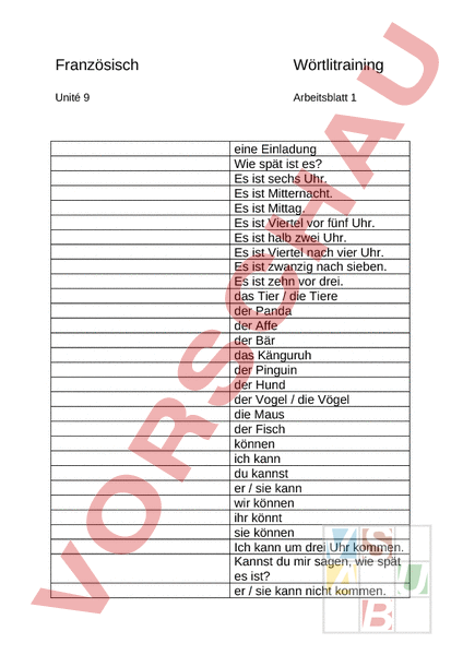 Französisch Wörtlitraining Unité 9 Arbeitsblatt 1 eine Einladung Wie spät ist es? Es ist sechs Uhr. Es ist Mitternacht. Es ist Mittag. Es ist Viertel vor fünf Uhr. Es ist halb zwei Uhr. Es ist Viertel nach vier Uhr. Es ist zwanzig nach sieben. Es ist zehn vor drei. das Tier die Tiere der Panda der Affe der Bär das Känguruh der Pinguin der Hund der Vogel die Vögel die Maus der Fisch können ich kann du kannst er sie kann wir können ihr könnt sie können Ich kann um drei Uhr kommen. Kannst du mir sagen, wie spät es ist? er sie kann nicht kommen. Hallo, guten Tag Frau .Hier ist Carole. Ist Chantal zu Hause? Ja, sie ist da. Salü, ich bins,. Wie geht es? Geht es dir gut? Ich lade dich ein. Sympathisch nett, danke. Ich mache ein Fest am Samstag. Lässig. Wir haben keine Schule. Schade, ich kann nicht kommen. Ich habe von 8 bis 12 Uhr Schule. Wo? Bei mir, zu Hause. Um wie viel Uhr? Um drei Uhr. Bis Samstag, tschüss. Male aus! Malt aus! Arbeite! Arbeitet!
