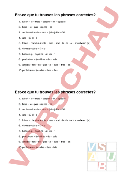 Estce que tu trouves les phrases correctes? 1. Morin – je – Marc – bonjour – – appelle 2. Nom – je – pas – naime – ce 3. anniversaire – le – mon – jai – juillet – 30 4. ans – 32 ai – 5. loisirs – planche à voile – mes – sont le – la et – snowboard (m) 6. cinéma – aime – – le 7. beaucoup – copains – ai –de 8. producteur – je – films – de suis 9. anglais – fort – ne – pas – je – suis – très en 10. publicitaires je – des – films – fais Estce que tu trouves les phrases correctes? 1. Morin – je – Marc – bonjour – – appelle 2. Nom – je – pas – naime – ce 3. anniversaire – le – mon – jai – juillet – 30 4. ans – 32 ai – 5. loisirs – planche à voile – mes – sont le – la et – snowboard (m) 6. cinéma – aime – – le 7. beaucoup – copains – ai –de 8. producteur – je – films – de suis 9. anglais – fort – ne – pas – je – suis – très en 10. publicitaires je – des – films fais Estce que tu trouves les phrases correctes? 1. Morin – je – Marc – bonjour – – appelle 2. Nom – je – pas – naime – ce 3. anniversaire – le – mon – jai – juillet – 30 4. ans – 32 ai – 5. loisirs – planche à voile – mes – sont le – la et – snowboard (m) 6. cinéma – aime – – le 7. beaucoup – copains – ai –de 8. producteur – je – films – de suis 9. anglais – fort – ne – pas – je – suis – très en 10. publicitaires je – des – films fais