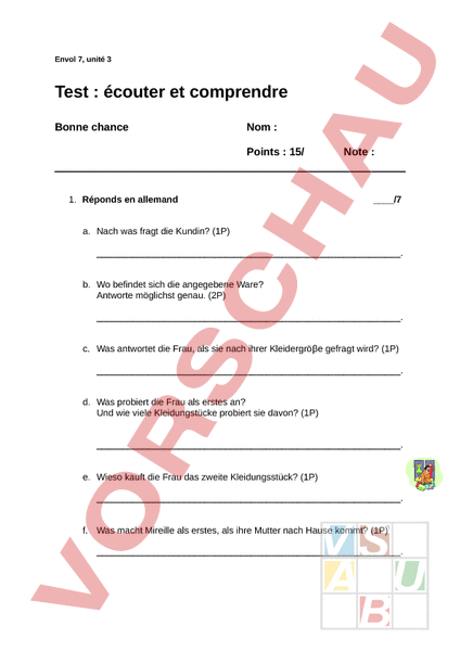 Envol 7, unité 3 Test écouter et comprendre Bonne chance Nom Points 15/ 1. Réponds en allemand Note /7 a. Nach was fragt die Kundin? (1P). b. Wo befindet sich die angegebene Ware? Antworte möglichst genau. (2P). c. Was antwortet die Frau, als sie nach ihrer Kleidergröe gefragt wird? (1P). d. Was probiert die Frau als erstes an? Und wie viele Kleidungstücke probiert sie davon? (1P). e. Wieso kauft die Frau das zweite Kleidungsstück? (1P). f. Was macht Mireille als erstes, als ihre Mutter nach Hause kommt? (1P). 2. vrai? – faux? – pas connu? 1. La cliente sappelle Mme Renaud. /8 vrai faux p.c. 2. La vendeuse veut savoir la taille de la cliente. 3. La cliente cherche quelque chose de chic. 4. Le chemisier bleu ne plaît pas à la cliente. 5. Mireille naime pas le chemisier de sa maman. 6. Michelle peut sortir cet après-midi. 7. Michelle peut porter le chemisier de sa maman. 8. Michelle ne doit pas faire ses devoirs. Bonne chance!!!