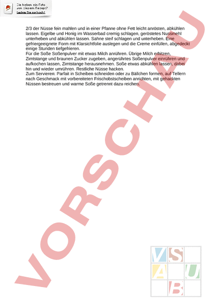 2/3 der Nüsse fein mahlen und in einer Pfanne ohne Fett leicht anrösten, abkühlen lassen. Eigelbe und Honig im Wasserbad cremig schlagen, geröstetes Nussmehl unterheben und abkühlen lassen. Sahne steif schlagen und unterheben. Eine gefriergeeignete Form mit Klarsichtfolie auslegen und die Creme einfüllen, abgedeckt einige Stunden tiefgefrieren. Für die Soße Soßenpulver mit etwas Milch anrühren. Übrige Milch erhitzen, Zimtstange und braunen Zucker zugeben, angerührtes Soßenpulver einrühren und aufkochen lassen, Zimtstange herausnehmen. Soße etwas abkühlen lassen, dabei hin und wieder umrühren. Restliche Nüsse hacken. Zum Servieren: Parfait in Scheiben schneiden oder zu Bällchen formen, auf Tellern nach Geschmack mit vorbereiteten Frischobstscheiben anrichten, mit gehackten Nüssen bestreuen und warme Soße getrennt dazu reichen.