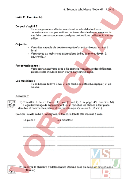 4. Sekundarschulklasse Niederwil, 17.09.12 Unité 11, Exercice 1d) De quoi sagit-il Tu vas apprendre à décrire une chambre – tout dabord sans connaissances des prépositions de lieu et dans le dernier exercice tu vas faire connaissance avec quelques prépositions de lieu et tu vas les utiliser. Objectifs - Vous êtes capable de décrire une pièce/une chambre par écrit et à loral. Vous savez au moins cinq expressions de lieu (derrière, devant à gauche de). Pré-connaissance Vous connaissez/vous avez déjà appris le vocabulaire des différentes pièces et des meubles quon trouve dans une maison. Les matériaux Tu as besoin du livre Envol 7, une feuille de notes (Notizpapier) et un crayon. Exercice 1 1.) Travaillez à deux Prenez le livre (Envol 7) à la page 48, exercice 1d). Regardez limage de lappartement fou et remettez les choses à leur place. Identifiez et nommez les pièces et les meubles qui sy trouvent. (10 min.) Exemple la salle de bain la baignoire, le lavabo, la toilette et la machine à laver. La pièce Les meubles 2.) Décrivez la chambre dadolescent de Damian avec au minimum cinq phrases. (10 min.) 4. Sekundarschulklasse Niederwil, 17.09.12 Exercice 2 1.) Travaille seul. Prends une feuille et décrive en quelques phrases ta chambre à la maison en utilisant au minimum cinq meubles. Noublie pas à expliquer quel meuble tu utilises pour faire quoi. Exemple Dans ma chambre il a un bureau. Je lutilise surtout pour faire mes devoirs après lécole ou pour écrire des lettres à mes copains. (15 min.) 2.) Travaillez à deux. Décrive ta chambre à ton partenaire. Essaie de parler assez librement sans être attacher à ta feuille. (5 min.) 3.) Crée un dessin qui présente ta chambre et tentraîne à présenter ta chambre devant la classe. Tu as le droit dutiliser ton dessin pendant la petite présentation mais évite dutiliser une feuille de notes. (15-20 min.) Exercice 3 4. Sekundarschulklasse Niederwil, 17.09.12 Certainement vous avez remarqué quil faut connaître des prépositions de lieu pour décrire une chambre plus précisément. Regardez bien limage à la page 49 dans lEnvol et essayez décrire une phrase pour chaque situation suivante. (15 min.) Exemple 1) la petite personne se trouve à coté du cube (Würfel math.)
