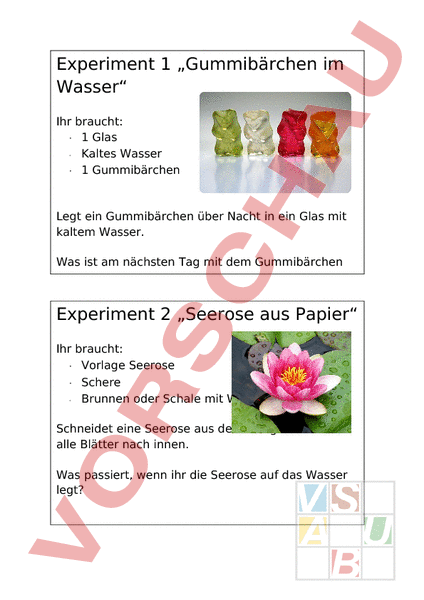 Arbeitsblatt: Experimente Wasser