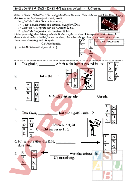 So oder ? DAS – DASS Teste dich selbst! R-Training Setze in diesem „Selbst-Test die richtige das-/dass- Form ein! Kreuze dann die richtige Bezeichnung des Wortes an, das du eingesetzt hast, wobei „das als Artikel die Kurzform hat, „das als Demonstrativpronomen die Kurzform hat, „das als Relativpronomen die Kurzform hat, „dass als Konjunktion die Kurzform hat. Hinter jeder möglichen Lösung steht ein Buchstabe, der zu einem Lösungswort gehört. Wenn du diese hintereinander schreibst, kannst du sehen, ob du das richtige Lösungswort erhältst und deine Antworten alle richtig sind. Beispiel: l Lösungsbuchstabe Das Auto ist gelb. a Hier ist Das ein Artikel, deshalb A) K p 1. Ich glaube, Arbeit nicht immer gesund ist. A A 2. tut weh! 3. R Ü Ö R Das Haus, dort steht, gefällt mir. A R M Lesen bildet, ist % nicht immer richtig. 6. Ich spreche über das Bild, dort hängt. 7. D K M T A Mich stört gerade Gerede. 4. 5. R E R D K war eine erfreuliche Überraschung. S K E R 8. Tobias glaubt, durch seine Kommentare der Unterricht interessanter wird. 9. R K M O Ulla die größte E ist, glaubt doch jeder! R Hubert meint aber nicht! 10. 11. R Hilde weiß es zu schätzen, R alle sie lieben. D K 12. Horst wirft das Kaugummi, sowieso nicht schmeckt, in den Papierkorb. A R K Ö Ich denke, in dem Haus, M dort steht, wohnt Achmed. U A O 14. Kurt lügt, halten alle U für unmöglich! R K A D 15. Hier seht ihr, Lehrer X auch mal freundlich sein können. E 13. LÖSUNGSWORT: R B