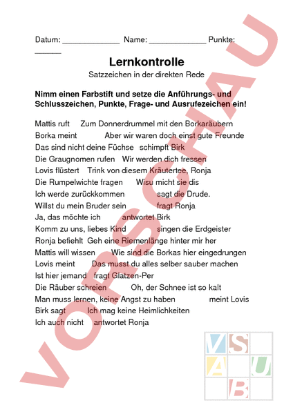 Datum: Name: Punkte: Lernkontrolle Satzzeichen in der direkten Rede Nimm einen Farbstift und setze die Anführungs und Schlusszeichen, Punkte, Frage und Ausrufezeichen ein! Mattis ruft Zum Donnerdrummel mit den Borkaräubern Borka meint Aber wir waren doch einst gute Freunde Das sind nicht deine Füchse schimpft Birk Die Graugnomen rufen Wir werden dich fressen Lovis flüstert Trink von diesem Kräutertee, Ronja Die Rumpelwichte fragen Wisu micht sie dis Ich werde zurückkommen sagt die Drude. Willst du mein Bruder sein fragt Ronja Ja, das möchte ich antwortet Birk Komm zu uns, liebes Kind singen die Erdgeister Ronja befiehlt Geh eine Riemenlänge hinter mir her Mattis will wissen Wie sind die Borkas hier eingedrungen Lovis meint Das musst du alles selber sauber machen Ist hier jemand fragt GlatzenPer Die Räuber schreien Oh, der Schnee ist so kalt Man muss lernen, keine Angst zu haben meint Lovis Birk sagt Ich mag keine Heimlichkeiten Ich auch nicht antwortet Ronja