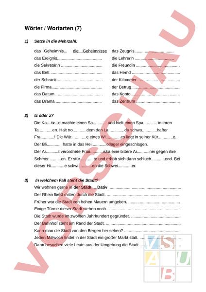Wörter Wortarten (7) 1) Setze in die Mehrzahl: das Geheimnis. 2) die Geheimnisse das Zeugnis das Ereignis. die Lehrerin die Sekretärin die Freundin das Bett . das Hemd der Schrank . der Kilometer . die Firma der Betrug das Datum . das Konto das Drama. das Zentrum tz oder z? Die Katz.e machte einen Sa und hielt einen Spa in ihren Taen. Halt trodem den La, du schwa.hafter Fra! Die Wür.e eines Wi.es liegt in seiner Kür.e. Der Bli. hatte in das Hei.öllager eingeschlagen. Der Ar.t verordnete Fran.iska eine bittere Ar.nei gegen ihre Schmer.en. Er stürte und erhob sich dann schluchend. Bei dieser Hie schwien die Schweier. 3) In welchem Fall steht die Stadt? Wir wohnen gerne in der Stadt. .Dativ . Der Rhein fließt mitten durch die Stadt. Früher war die Stadt von hohen Mauern umgeben. . Einige Türme dieser Stadt stehen noch. . Die Stadt wurde im zwölften Jahrhundert gegründet. . Der Bahnhof steht am Rand der Stadt. . Kann man die Stadt von den Bergen her sehen? . Jeden Mittwoch findet in der Stadt ein großer Markt statt. Dann besuchen viele Leute aus der Umgebung die Stadt. .