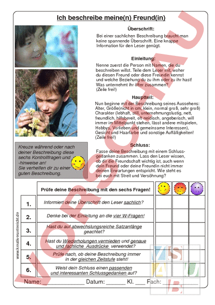 Ich beschreibe meine(n) Freund(in) Überschrift: Bei einer sachlichen Beschreibung braucht man keine spannende Überschrift. Eine knappe Information für den Leser genügt. Einleitung: Nenne zuerst die Person mit Namen, die du beschreiben willst. Teile dem Leser mit, woher du diesen Freund oder diese Freundin kennst und welche Beziehung du zu ihm oder zu ihr hast! Was unternehmt ihr öfter zusammen? (Zeile frei!) Hauptteil: Nun beginne mit der Beschreibung seines Aussehens: Alter, Größe(nicht in cm, klein, normal groß, sehr groß) Charakter (lebhaft, still, unternehmungslustig, nett, freundlich, hilfsbereit, oft neidisch, angeberisch, will immer im Mittelpunkt stehen, lässt andere mitspielen, Hobbys, Vorlieben und gemeinsame Interessen), Gesicht und Haarfarbe und sonstige Auffälligkeiten! (Zeile frei!) Kreuze während oder nach deiner Beschreibung diese sechs Kontrollfragen und -hinweise an! Sie verhelfen dir zu einer guten Beschreibung. Schluss: Fasse deine Beschreibung mit einem Schlussgedanken zusammen. Lass den Leser wissen, ob dir die Freundschaft wichtig ist, auch wenn dein Freund oder deine Freundin nicht immer deinen Erwartungen entspricht. Wie steht es bei euch mit Streit und Versöhnung? www.kreativerunterricht.de Prüfe deine Beschreibung mit den sechs Fragen! 1. Informiert deine Überschrift den Leser sachlich? 2. Denke bei der Einleitung an die vier W-Fragen! 3. Hast du auf abwechslungsreiche Satzanfänge geachtet? 4. Hast du Wiederholungen vermieden und genaue und fachliche Ausdrücke verwendet? 5. Prüfe nach, ob deine Beschreibung immer in der gleichen Zeitstufe steht! 6. Weist dein Schluss einen passenden und interessanten Schlussgedanken auf? Name: Datum: Kl. Fach: