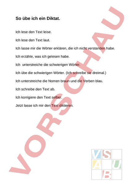So übe ich ein Diktat. Ich lese den Text leise. Ich lese den Text laut. Ich lasse mir die Wörter erklären, die ich nicht verstanden habe. Ich erzähle, was ich gelesen habe. Ich unterstreiche die schwierigen Wörter. Ich übe die schwierigen Wörter. (Ich schreibe sie dreimal.) Ich unterstreiche die Nomen braun und die Verben blau. Ich schreibe den Text ab. Ich korrigiere den Text selber. Jetzt lasse ich mir den Text diktieren.