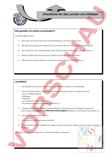 Checkliste für das Lernen von Diktaten Wie gestalte ich meine Lernsituation? Ich beachte folgende Punkte: • Wann kann ich besonders leicht lernen (nach dem Mittagessen? Vor dem Nachtessen? etc.) • Wie lange kann ich konzentriert arbeiten? Soll ich eine Stunde üben oder besser zweimal eine halbe Stunde? • Wo soll ich lernen? An welchem Arbeitsplatz habe ich Ruhe, genügend Arbeitsfläche, keine Ablenkung etc.? • Welche Lernhilfen kann ich einsetzen (z.B. Tonband, um sich Texte selbst zu diktieren) • Wie kann ich besser lernen, alleine oder mit anderen zusammen (Freunde, Mutter, Vater etc.) Lernablauf 1. Ich verschaffe mir zuerst einen Überblick über das ganze Diktat, indem ich es einmal durchlese. 2. Ich suche alle Wörter heraus, bei denen mir die Rechtschreibung nicht vertraut ist. Dabei achte ich auf Gross und Kleinschreibung Schärfungen Dehnungen äu/eu und andere Besonderheiten. Diese Wörter markiere ich (unterstreichen, übermalen etc.) 3. Ich präge mir die Rechtschreibung der markierten Wörter ein. Dazu benütze ich verschiedene Strategien (z.B. Rechtschreibestrategie [siehe „21 Rechtschreibstrategien], Ableiten vom Wortstamm, Wortfamilien etc.). 4. Ich lasse mir das ganze Diktat diktieren. 5. Ich korrigiere das Diktat und markiere die Fehler. 6. Ich präge mir die korrekte Schreibweise der markierten Wörter im Diktat ein. Wiederum benütze ich dazu verschiedene Strategien. Die Schritte 3 bis 6 gehe ich so lange durch, bis ich mit dem Ergebnis zufrieden bin.