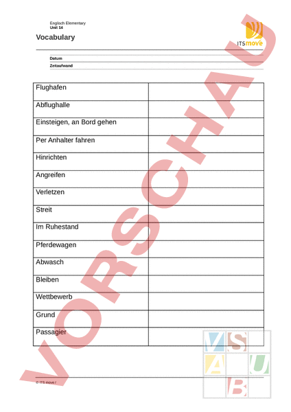 Englisch Elementary Unit 14 Vocabulary Datum Zeitaufwand Flughafen Abflughalle Einsteigen, an Bord gehen Per Anhalter fahren Hinrichten Angreifen Verletzen Streit Im Ruhestand Pferdewagen Abwasch Bleiben Wettbewerb Grund Passagier ITS move