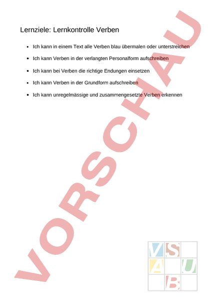 Lernziele: Lernkontrolle Verben • Ich kann in einem Text alle Verben blau übermalen oder unterstreichen • Ich kann Verben in der verlangten Personalform aufschreiben • Ich kann bei Verben die richtige Endungen einsetzen • Ich kann Verben in der Grundform aufschreiben • Ich kann unregelmässige und zusammengesetzte Verben erkennen