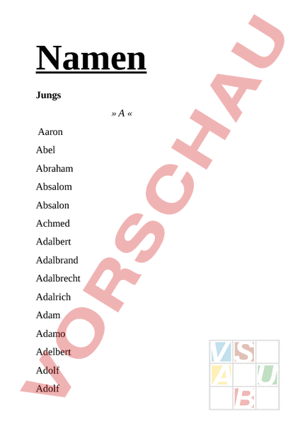 Namen Jungs »A « Aaron Abel Abraham Absalom Absalon Achmed Adalbert Adalbrand Adalbrecht Adalrich Adam Adamo Adelbert Adolf Adolf Adolph Adolphe Adriaan Adrian Adriano Adrien Ahmed Alain Alan Alban Alberich Albert Albin Albrecht Albuin Aldo Aldobrando Aleksandr Alessandro Alessio Alex Alexander Alexei Alexis Alfons Alfred Aljoscha Alois Aloys Alrich AlrikAlto Alwin Amadeo Amadeus Amandus Amatus Ambros Ambrosius Anastasius Anatol Anatolij Andi André Andreas Andrej Andrew Andy Angel Angelus Anianus Anouk Ansbald Anselm Ansfried Ansgar Anthony Anton Antonio Arbogast Arend Ari Arian Aribert Ariel Armand Armel Armin Arminius Arne Arnim Arnold Arnt Arnulf Aron Artho Arthur Artur Arturo Arvid Arvit Arwid Arwit Athanasios Athanasius August Axel