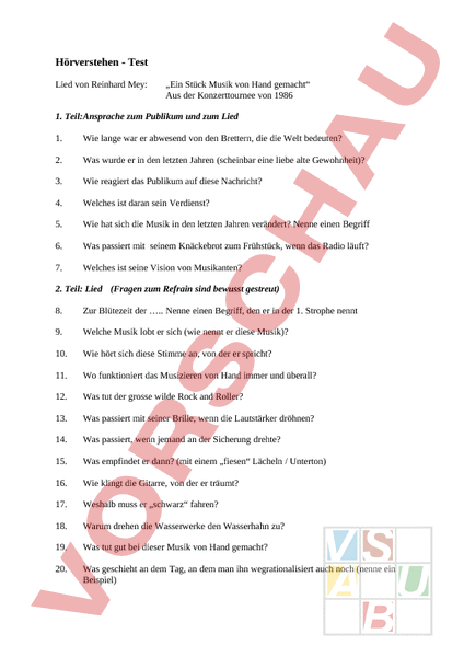 Hörverstehen Test Lied von Reinhard Mey: „Ein Stück Musik von Hand gemacht Aus der Konzerttournee von 1986 1. Teil:Ansprache zum Publikum und zum Lied 1. Wie lange war er abwesend von den Brettern, die die Welt bedeuten? 2. Was wurde er in den letzten Jahren (scheinbar eine liebe alte Gewohnheit)? 3. Wie reagiert das Publikum auf diese Nachricht? 4. Welches ist daran sein Verdienst? 5. Wie hat sich die Musik in den letzten Jahren verändert? Nenne einen Begriff 6. Was passiert mit seinem Knäckebrot zum Frühstück, wenn das Radio läuft? 7. Welches ist seine Vision von Musikanten? 2. Teil: Lied (Fragen zum Refrain sind bewusst gestreut) 8. Zur Blütezeit der Nenne einen Begriff, den er in der 1. Strophe nennt 9. Welche Musik lobt er sich (wie nennt er diese Musik)? 10. Wie hört sich diese Stimme an, von der er spricht? 11. Wo funktioniert das Musizieren von Hand immer und überall? 12. Was tut der grosse wilde Rock and Roller? 13. Was passiert mit seiner Brille, wenn die Lautstärker dröhnen? 14. Was passiert, wenn jemand an der Sicherung drehte? 15. Was empfindet er dann? (mit einem „fiesen Lächeln Unterton) 16. Wie klingt die Gitarre, von der er träumt? 17. Weshalb muss er „schwarz fahren? 18. Warum drehen die Wasserwerke den Wasserhahn zu? 19. Was tut gut bei dieser Musik von Hand gemacht? 20. Was geschieht an dem Tag, an dem man ihn wegrationalisiert auch noch (nenne ein Beispiel)