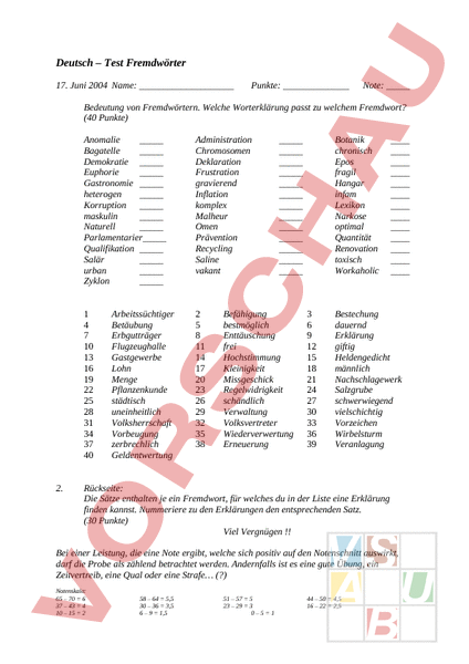 Deutsch – Test Fremdwörter 17. Juni 2004 Name: Punkte: Note: Bedeutung von Fremdwörtern. Welche Worterklärung passt zu welchem Fremdwort? (40 Punkte) 2. Anomalie Bagatelle Demokratie Euphorie Gastronomie heterogen Korruption maskulin Naturell Parlamentarier_ Qualifikation Salär urban Zyklon Administration Chromosomen Deklaration Frustration gravierend Inflation komplex Malheur Omen Prävention Recycling Saline vakant 1 4 7 10 13 16 19 22 25 28 31 34 37 40 2 5 8 11 14 17 20 23 26 29 32 35 38 Arbeitssüchtiger Betäubung Erbgutträger Flugzeughalle Gastgewerbe Lohn Menge Pflanzenkunde städtisch uneinheitlich Volksherrschaft Vorbeugung zerbrechlich Geldentwertung Befähigung bestmöglich Enttäuschung frei Hochstimmung Kleinigkeit Missgeschick Regelwidrigkeit schändlich Verwaltung Volksvertreter Wiederverwertung Erneuerung Botanik chronisch Epos fragil Hangar infam Lexikon Narkose optimal Quantität Renovation toxisch Workaholic 3 6 9 12 15 18 21 24 27 30 33 36 39 Bestechung dauernd Erklärung giftig Heldengedicht männlich Nachschlagewerk Salzgrube schwerwiegend vielschichtig Vorzeichen Wirbelsturm Veranlagung Rückseite: Die Sätze enthalten je ein Fremdwort, für welches du in der Liste eine Erklärung finden kannst. Nummeriere zu den Erklärungen den entsprechenden Satz. (30 Punkte) Viel Vergnügen !! Bei einer Leistung, die eine Note ergibt, welche sich positiv auf den Notenschnitt auswirkt, darf die Probe als zählend betrachtet werden. Andernfalls ist es eine gute Übung, ein Zeitvertreib, eine Qual oder eine Strafe (?) Notenskala: 65 – 70 6 37 – 43 4 10 – 15 2 58 – 64 5,5 30 – 36 3,5 6 – 9 1,5 51 – 57 5 23 – 29 3 0–51 44 – 50 4,5 16 – 22 2,5