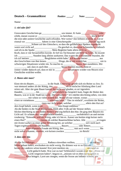 Deutsch – Grammatiktest Punkte:/ Note: Name: 1. viel oder fiel? Grossvaters Geschichten ge uns immer. Er hatte erlei erlebt, darum wusste er zu berichten.leicht hat er die eine oder andere Geschichte auch erfunden. Wer weiss? Am liebsten erzählte er, wie er einmal vor Jahren in eine Gletscherspalte . „Damals lag noch Schnee auf den Gletschern, so dass die gefährlichen Spalten zugedeckt waren und nicht auf_. Da geschah es, dass eine Schneedecke einbrach und ich in die Spalte. Mein Begleiter hatte allein nicht so Kraft, dass er mir heraushelfen konnte. Er lief ins Tal hinunter um Hilfe zu holen. So musste ich Stunden lang alleine ausharren. Das waren die schlimmsten Stunden, die ich auf meinen Bergfahrten erlebt habe. Ich konnte immer aus den Geschichten von ihm lernen. Dinge, die er mir erzählt hat, mir in schwierigen Situationen wieder ein. So machte es Spass, ihm zuzuhören. Mir auf, dass es auch ihm Spass machen musste, denn er immer wieder dadurch auf, dass er mir in Situationen wieder von Neuem eine Geschichte erzählen wollte. 2. Mann oder man? Einst ritt ein Bauers_ in die Stadt. Unterwegs gesellt sich ein Reiter zu ihm. Es war niemand anders als der König, den oft in einfacher Kleidung über Land reiten sah. Aber der gute Bauer kannte ihn nicht und glaubte, es sei irgendein Handels. Als schliesslich ins Gespräch kam, fragte der Reiter den Bauern, was er in der Stadt tun wolle. Der antwortete: Ich möchte den König sehen, von dem mir schon so vieles erzählt hat. Wenn ich nur wüsste, woran einen so vornehmen erkennen kann. Das ist einfach, erwiderte der Reiter, „_ muss nur Acht geben, welcher allein den Hut auf dem Kopf behält, wenn jeder sein Haupt entblösst. Als die beiden in die Stadt hineinritten, blieb alles Volk auf der Strasse stehen. blickte ehrerbietig zu den beiden Reitern und zog höflich den Hut. Da ging dem Bauern ein Licht auf. Er schaute den vermeintlichen Handels_ nachdenklich an und meinte treuherzig: Entweder seid Ihr König, oder ich bin es. Ausser uns beiden trägt keiner mehr einen Hut! musste ob solcher Bauernschläue lachen. Alleer trugen mit ihrem Lachen zu einer guten Stimmung bei, an welcher sich noch nach Tagen ergötzen konnte. Ob Handels_, Bauers oder Ritters, hatte allgemein Freude am König, den nun auch wenn ihn nicht sofort erkannte, verehrte, wie keinen zweiten im Reich! 3. dass oder das Als die Schildbürger Rathaus einweihen wollten, sie mit viel Mühe gebaut hatten, erschraken sie nicht wenig. Da drinnen war es so findster, keiner den anderen sehen konnte! Erst jetzt merkten sie, niemand an Licht gedacht hatte. Was war zu tun? Schliesslich wusste einer Rat. „Wenn wir Licht vergessen haben, begann er, „müssen wir es eben nachträglich in Haus bringen. Lasst uns morgen, wenn die Sonne am hellsten scheint, vor Rathaus gehen! Dann werden wir Licht mit Säcken, Kesseln und Eimern einfangen und schnell in Rathaus tragen! Gesagt, getan. Weit öffneten sie am nächsten Tag ihre Säcke, so sie sich bis auf den Grund mit Licht füllen konnten. Dann schnürten sie diese rasch zu und rannten damit in Rathaus, um dort Licht auszuschütten. Wie enttäuscht waren sie aber, als sie merkten, alles umsonst gewesen war! Sie trösteten sich damit, sie wenigstens auf Gemeindekosten in Wirtshaus gehen und ihren Durst löschen konnten. tat gut, um die verwundeten Seelen zu trösten. Denn Einfangen des Lichts, draussen so massenhaft vorkommt, war nun wirklich nicht, was man allgemein als brauchbare Idee benennen konnte. aber ausgerechnet ihnen der Fehler passierte, keine Fenster zu machen in Rathaus, wollte ihnen einfach nicht in Gehirn. aber trotzdem eine gute Übung ist, um zu lernen ob ein ein „s oder zwei erhält, sollte man nicht vergessen! 4. seit oder seid? herzlich willkommen! ihr gut gereist? wann ihr unterwegs? sieben Uhr morgens. Wie nett, dass ihr alle an den Bahnhof gekommen. Ei, Kinder, wie ihr gewachsen! wann haben wie einander nicht mehr gesehen? Ich glaube, Weihnachten. Aber so gut und kommt jetzt! Marianne, Jürg, so freundlich und tragt der Tante und dem Onkel die Pakete und Taschen ins Auto! Wie? Ihr mit dem Auto zum Bahnhof gefahren? wann habt ihr denn einen Wagen? Erst einem Monat. Aber jetzt so gut und steigt ein! Kinder, ihr könnt zu Fuss gehen! wir das Vehikel haben, ihr bequem geworden. Sehr wahrscheinlich ihr sogar vor uns zu Hause! Das ist bei diesem Verkehr leicht möglich. Auf Wiedersehen daheim! bitte auf der Strasse vorsichtig. hier nämlich das neue Quartier gebaut wurde, ist der Verkehr schier unerträglich. ihr auch so belastet mit dem Verkehr? Schliesst die Türe, wenn ihr angekommen. es so viele Menschen hat, wird hier auch viel mehr gestohlen. Die Polizei meint immer: so gut und meldet uns einen Diebstahl. dem letzten Sommer sind hier schon viele Einbrüche passiert. 5. war oder wahr? Das eine Aufregung, als der erste Flug des Luftschiffes Zeppelin angekündigt wurde. Alle Zeitungenen voll von diesem sensationellen Ereignis. Der Zeppelin ein Riesenballon, aus Aluminium, Draht und Leinwand gebaut. Er zigarrenförmig und hatte eine Länge von 128 Metern und über zehn Tonnen schwer. Ermit Gas gefüllt und verfügte über zwei Motoren von je sechzehn Pferdestärken. Am 2. Juli 1900 der Probeaufstieg. Das Un_scheinliche geworden. Da stieg die riesige Zigarre mit leicht gehobener Spitze himmelwärts, ein es Wunder der Technik. Doch was geschah? Plötzlich nahm man, wie sich die Spitze des Luftschiffs wieder abwärts neigte. Eine Panne? Das durfte nicht sein. Aber leider es Der Zeppelin musste nach kurzer Zeit notlanden, weil das Höhensteuer beschädigt Der Probeflug e missglückt. Wo abere die Luftfahrt heute ohne all die missglückten Versuche. 6. In oder ihn im oder ihm? jener Zeit verirrte sich auch ein unschuldiger Krebs die Stadt Schilda. Als einige Bürger einem Loch entdeckten, gerieten sie in Panik, denn sie hatten noch nie zuvor ein solches Tier gesehen. Einer stieg sogar den Kirchenturm hinauf und läut