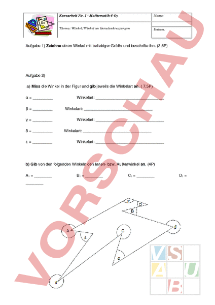 Kursarbeit Nr. 1 Mathematik 6 Gy Name: Thema: Winkel/Winkel an Geradenkreuzungen Datum: Aufgabe 1) Zeichne einen Winkel mit beliebiger Größe und beschrifte ihn. (2,5P) Aufgabe 2) a) Miss die Winkel in der Figur und gib jeweils die Winkelart an. 7,5P) Winkelart: Winkelart: Winkelart: Winkelart: Winkelart: b) Gib von den folgenden Winkeln den Innen bzw. Außenwinkel an. (4P) A1 B1 C1 D1 Kursarbeit Nr. 1 Mathematik 6 Gy Name: Thema: Winkel/Winkel an Geradenkreuzungen Datum: Aufgabe 3) Zeichne die folgenden Winkel. Beschriftung und Winkelbogen nicht vergessen. (5P) a) 57 b) (a,c) 93 c) 214 d) (k, m) 321 Aufgabe 4) In der GaußSchule wird eine 8 Rampe für Rollstuhlfahrer gebaut. Sie soll mit 8 ansteigen und 10m lang werden. (5P) a) Zeichne das Dreieck (wie Abbildung) mit der Länge 10 10 cm und dem Winkel 8. b) Ermittle die Höhe der Rampe (in Meter m). c) Die Schule möchte den Winkel auf 10 ändern. Ist das sinnvoll? Begründe deine Antwort. Aufgabe 5) Ermittle die gesuchten Winkelmaße durch Rechnung. (6P) 2 g1 II g2 g1 28 60 44 Aufgabe 6) Berechne die fehlenden Winkel und trage die Winkelgrößen ein. (4P) Kursarbeit Nr. 1 Mathematik 6 Gy Name: Thema: Winkel/Winkel an Geradenkreuzungen Datum: b) Nenne die Eigenschaft im Dreieck, die dir bei der Berechnung der fehlenden Winkel hilft. (1P) Aufgabe 7) Bestimme die Größe der Winkel zwischen den Uhrzeigern (3P) a) b) c) d) e) f) g) Erkläre kurz, wie du auf deine Angaben gekommen bist. (2P) Punktzahl: Prozent: Note: Kursarbeit Nr. 1 Mathematik 6 Gy Name: Thema: Winkel/Winkel an Geradenkreuzungen Datum: