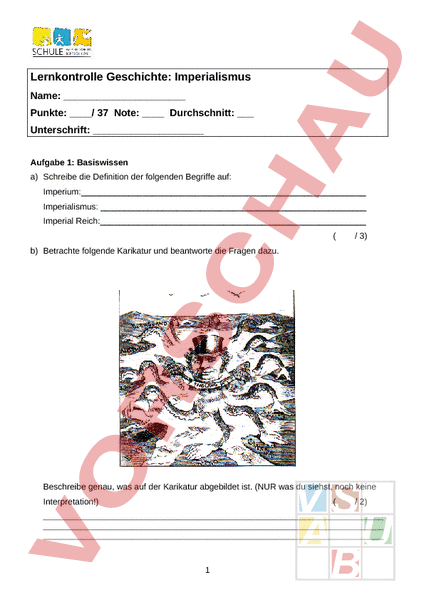 Lernkontrolle Geschichte: Imperialismus Name: Punkte: / 37 Note: Durchschnitt: Unterschrift: Aufgabe 1: Basiswissen a) Schreibe die Definition der folgenden Begriffe auf: Imperium: Imperialismus: Imperial Reich: 3) b) Betrachte folgende Karikatur und beantworte die Fragen dazu. Beschreibe genau, was auf der Karikatur abgebildet ist. (NUR was du siehst, noch keine Interpretation!) 1 2) Interpretiere nun die Karikatur? Was soll damit gezeigt werden? Verwende dazu die Begriffe Kolonialmacht, Kolonie und Imperium. 3) Aufgabe 2: Gründe für den Imperialismus a) Welches waren die Hauptgründe für den Imperialismus der europäischen Mächte? Nenne mindesten 5 Gründe. 5) Aufgabe 3: Sklavenhandel Fertige eine einfache Skizze an, wie der Sklavenhandel zwischen Europa und Amerika abgelaufen ist und beschreibe deine Skizze, indem du sagst, was die Europäer braucht und wie sie bezahlten. /4) 2 Aufgabe 4: Probleme und Lösungen der europäischen Mächte Welche Probleme hatten die europäischen Mächte zur Zeit des Imperialismus und wie konnten sie diese Probleme mit Hilfe der Kolonien lösen? Nenne 3 Probleme und die Lösungen. 3) a) Welche Kolonialmacht hatte um 1900 das grösste Kolonialreich? 1) b) Nenne zwei weiter Kolonialmächte. /2) c) Woran kann man heute noch feststellen, dass es in Afrika Kolonien gab? 1) Aufgabe 5: Die koloniale Aufteilung der Welt 3 Aufgabe 6: Gründung von Kolonialreichen Lies folgende Quelle durch: „Mafungu Biniami, Herr von Quatunge Quaniani, tritt hiermit durch sein Handzeichen das ihm gehörige Land für ewige Zeiten und zu völlig freier Verfügung an Karl Peters ab. Die Rechte, welche mit dieser Abtretung auf Karl Peters übergehen, sind unter anderem: das Recht, Strassen, Farmen, Bergwerke usw. anzulegen, Kolonisten in das Land zu führen, eigene Justiz und Verwaltung einzurichten, Zölle und Steuern aufzuerlegen. Dafür übernimmt Karl Peters, Mafungu Biniami und sein Volk zu schützen gegen jedermann und ihm ausser den am heutigen Tag übermittelten Geschenken eine Rente in Vieh und Handelsartikeln zu gewähren. (Karl Peters deutscher Politiker und Kolonialist) a) Worum könnte es sich bei dieser Quelle handeln? 1) b) Wie sind die europäischen Mächte sonst noch bei der Eroberung von Kolonien vorgegangen? 1) d) Weshalb war die Eroberung von nichteuropäischen Gebieten so schnell und einfach möglich? Nenne 2 Gründe. Aufgabe 7: Imperialismus a) Eine erfundene Landkarte. 4 2) Beschreibe die Karte. /3) b) Warum könnten die Grenzen von Kolonie 2 so zu liegen gekommen sein? /2) c) Welche Probleme könnten in diesen Gebieten bis heute noch auftreten? Wie wäre Europa davon betroffen? 5 /4)
