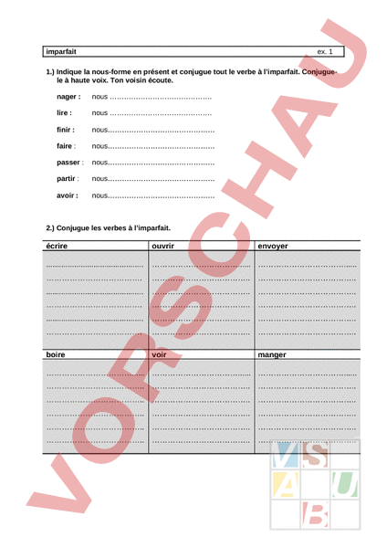 imparfait ex. 1 1.) Indique la nous-forme en présent et conjugue tout le verbe à limparfait. Conjuguele à haute voix. Ton voisin écoute. nager nous . lire nous . finir nous faire nous passer nous partir nous avoir nous 2.) Conjugue les verbes à limparfait. écrire ouvrir envoyer . . . . . . boire voir manger Solution 1.) nager nous nageons lire nous lisons finir nous finissons faire nous faisons passer nous passons partir nous partons avoir nous avons écrire ouvrir envoyer jouvrais jenvoyais tu ouvrais tu envoyais il ouvrait il envoyait nous ouvrions nous envoyions vous ouvriez vous envoyiez ils ouvraient ils envoyaient boire voir manger je buvais je voyais je mangeais tu buvais tu voyais tu mangeais il buvait il voyait il mangeait nous buvions nous voyions nous mangions vous buviez vous voyiez vous mangiez ils buvaient ils voyaient ils mangeaient jécrivais tu écrivais il écrivait nous écrivions vous écriviez ils écrivaient