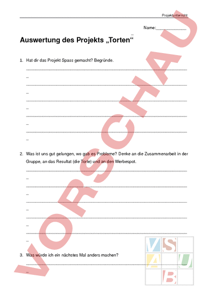 Projektunterricht Name:_ Auswertung des Projekts „Torten 1. Hat dir das Projekt Spass gemacht? Begründe. 2. Was ist uns gut gelungen, wo gab es Probleme? Denke an die Zusammenarbeit in der Gruppe, an das Resultat (die Torte) und an den Werbespot. 3. Was würde ich ein nächstes Mal anders machen? 4. Wer hatte welche Rolle in der Gruppe? (Wer führte die Gruppe, wer arbeitete viel, wer war eher passiv?): : :